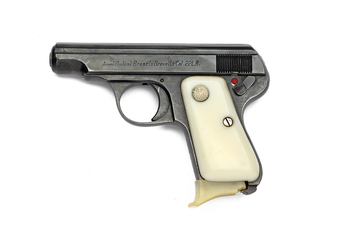 ** A BOXED ARMI GALESI .22 (L/R) POCKET SEMI-AUTOMATIC PISTOL, serial no. 107906, dated 1957, with 2 3/4in. barrel, blued slide and frame and white smooth plastic translucent grips, the magazine with finger extension, in its manufacturer's card carton