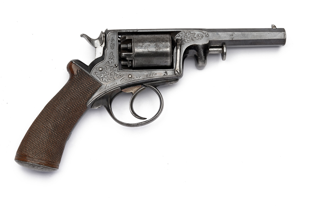 circa 1858 and being a licenced copy of the Adams, with octagonal 3 7/8in. barrel, dove-tailed fore-sight, standing notch rear-sight to the rear of the solid top-strap, the top-strap further signed 'A. FRANCOTTE A LIEGE', borderline and scroll engraved frame, plain borderline engraved five-shot cylinder with matching number, double action mechanism with spurred hammer, Kerr patent rammer and chequered walnut one-piece grip
