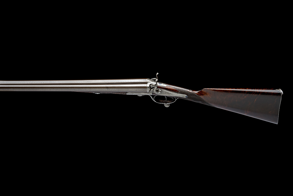 circa 1874, 29 7/8in. black powder only bold damascus barrels, the rib engraved 'ADKIN. MAKER. BEDFORD.', 2 1/2in. chambers, bored approx. true cyl. in both, some minor denting, Jones patent rotary-underlever, carved percussion fences, non-rebounding back-action locks with dolphin hammers, retaining very slight traces of original colour-hardening, 14 3/8in. figured stock including steel buttplate, weight 7lb. 10oz.