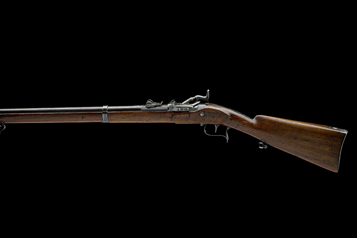 circa 1870, with 34in. barrel, block and blade fore-sight, elevating rear-sight, the top of barrel stamped 'KL' bisected with a shield forwards of the rear-sight together with the serial number, lift-up trapdoor conversion signed 'AMSLER-BLANK', flat polished hump-back lock signed 'BEURET FRERES LIEGE', walnut three-quarter stock, jaeger-style butt stamped 'KL' with the shield device over '205', iron furniture including two barrel bands and a nose-cap, cup-ended iron cleaning rod and iron swivels