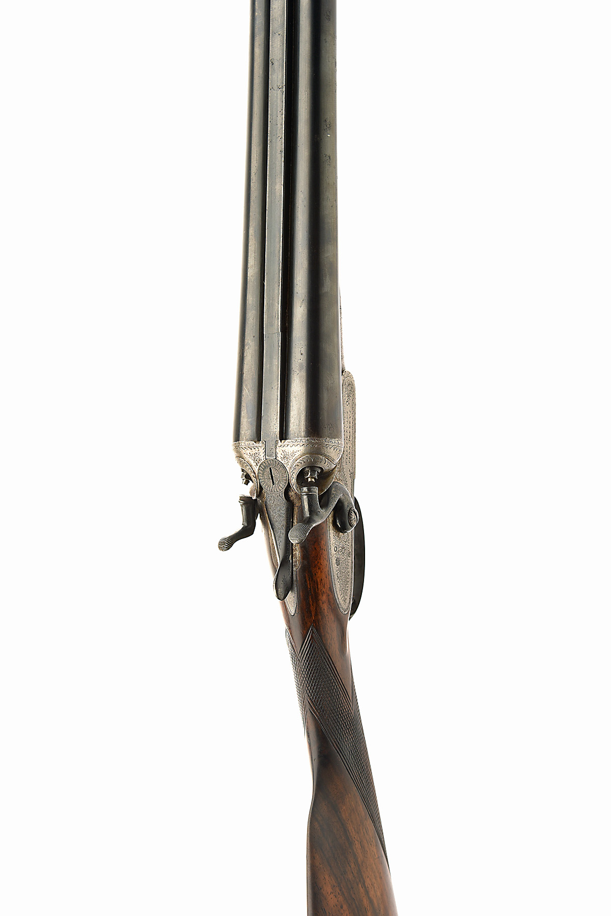 WILLIAM EVANS FROM PURDEY'S 12-BORE TOPLEVER HAMMERGUN, serial no. 2798, for 1894, 27 5/8in. (70cm) sleeved nitro barrels, 2 1/2in. chambers, bored approx. imp. cyl. choke in both, treble-grip action, carved percussion fences, rebounding sidelocks, on hammer replaced, border and acanthus scroll engraving, 14 3/4in. figured stock including 1/2in. buttplate, weight 6lb. 10oz.