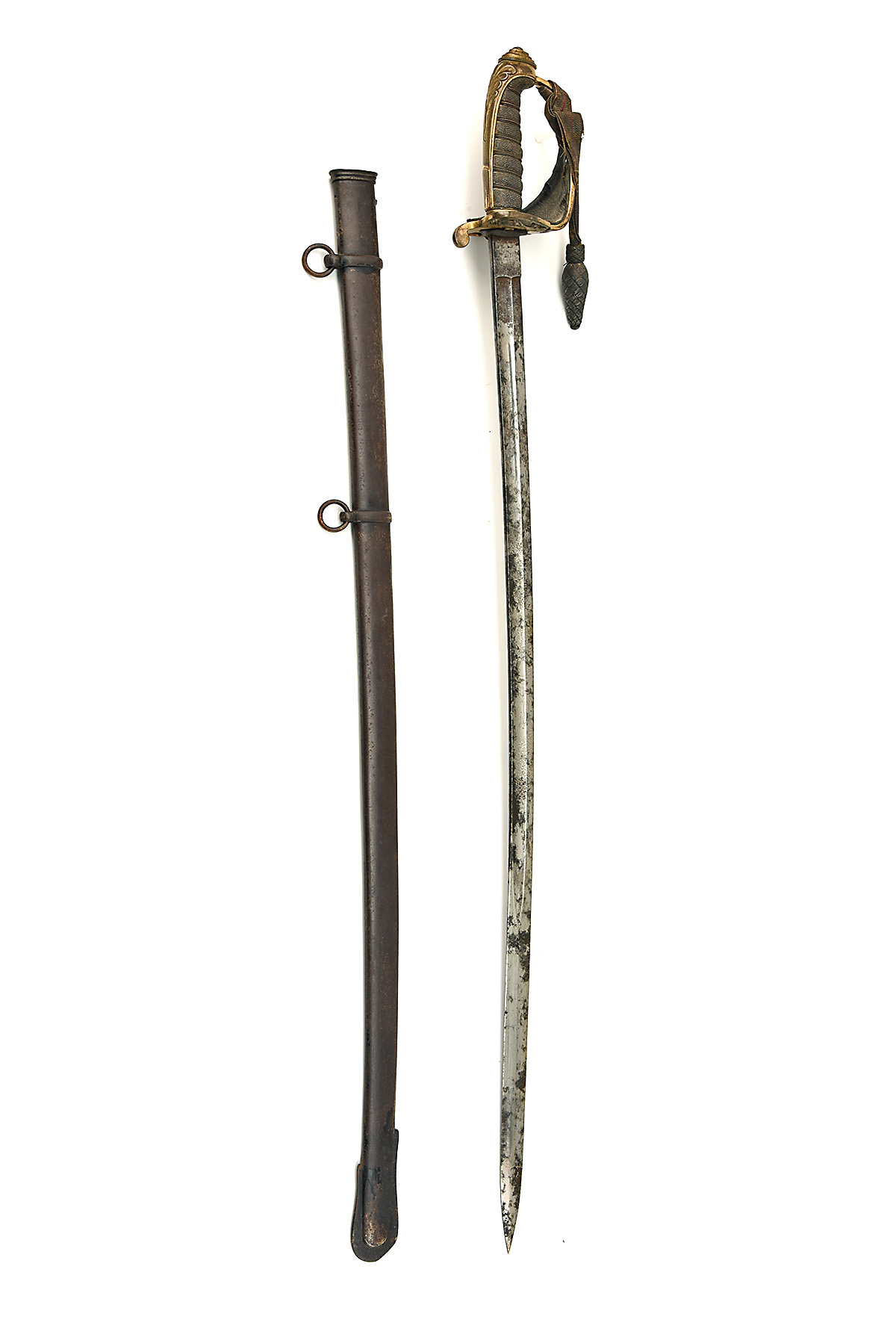 A PATTERN 1845 INFANTRY OFFICER'S SWORD, circa 1850, with 32 1/2 in. single-edged blade, fullered and etched on each side, ricasso with traces of retailer with 'proof' plug over, brass hilt, gothic guard of the earlier 1822 pattern with hinged sidepiece, royal cypher and original shagreen liner, original bullioned sword-knot, copper wire bound black fish-skin grip, together with its steel scabbard with two suspension loops, worn, blade with heavy pitting obscuring much of the etching, scabbard painted black, worn with some pitting at the chape but free from denting