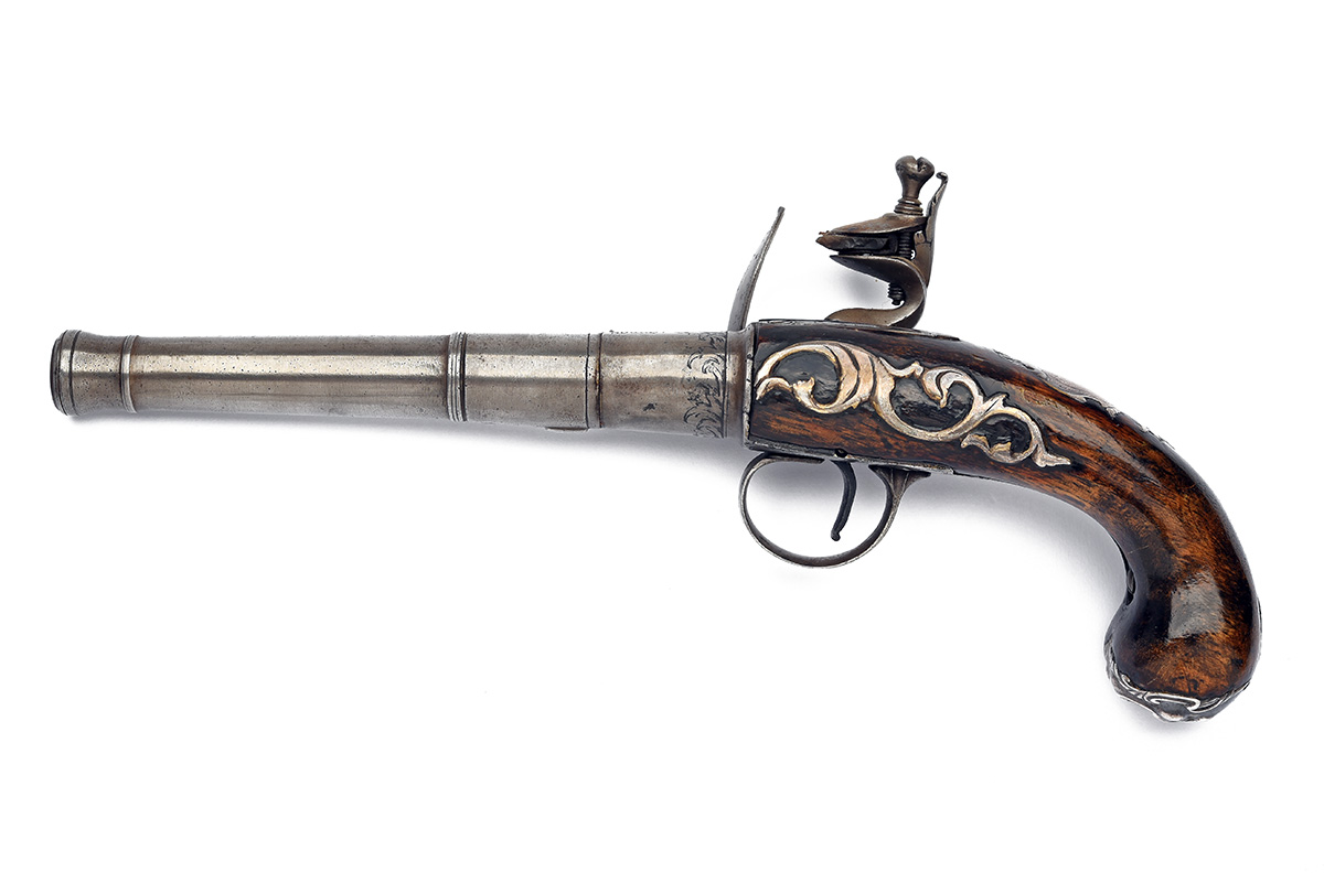 A 22-BORE FLINTLOCK QUEEN-ANNE HOLSTER-PISTOL SIGNED H. DELANY, no visible serial number,