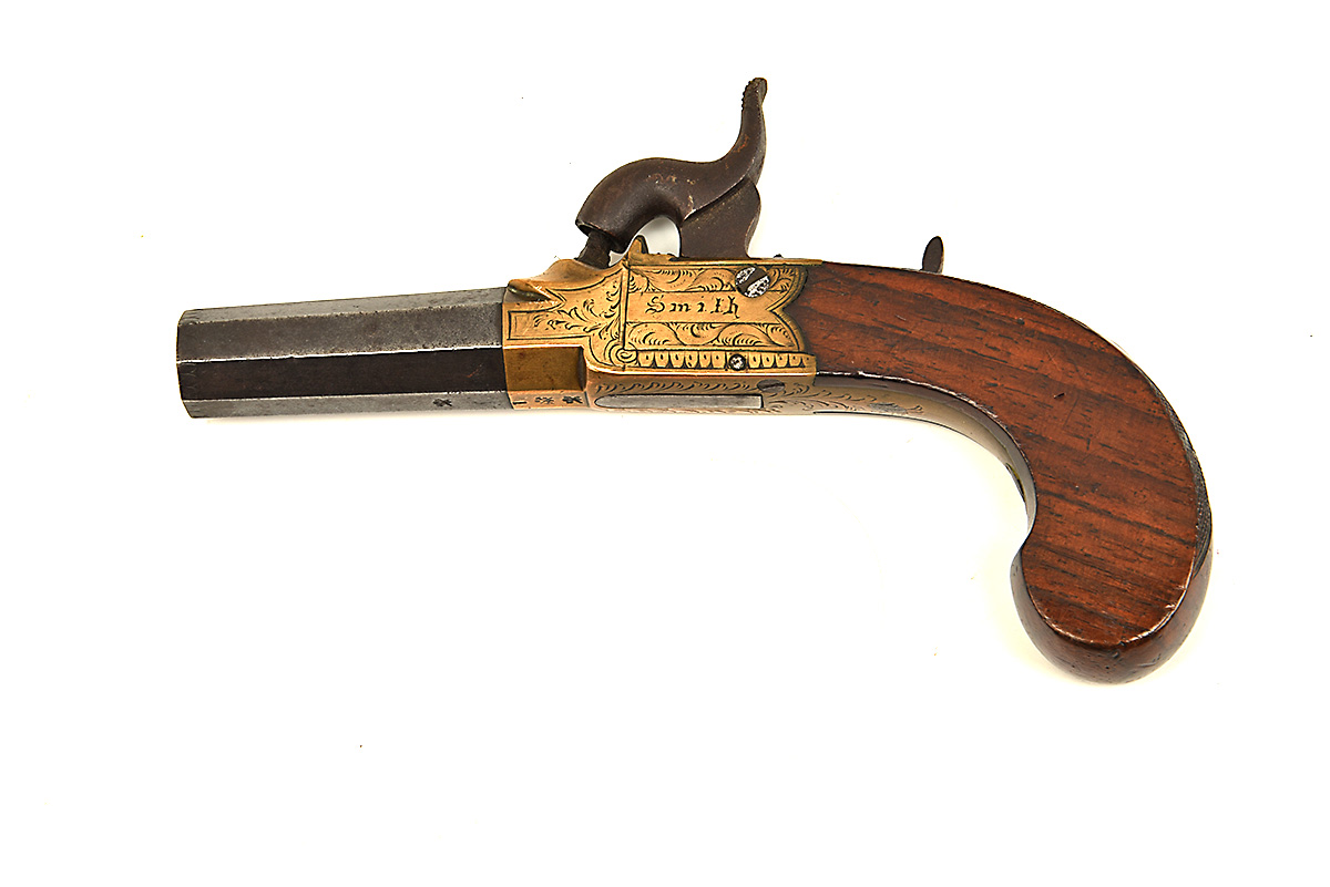 A 54-BORE PERCUSSION BRASS-FRAMED POCKET-PISTOL SIGNED SMITH, LONDON, no visible serial number, circa 1835, with tapering blued octagonal 1 7/8in. turn-off barrel, engraved and signed central hammer action with concealed automatic trigger and slab-sided walnut butt