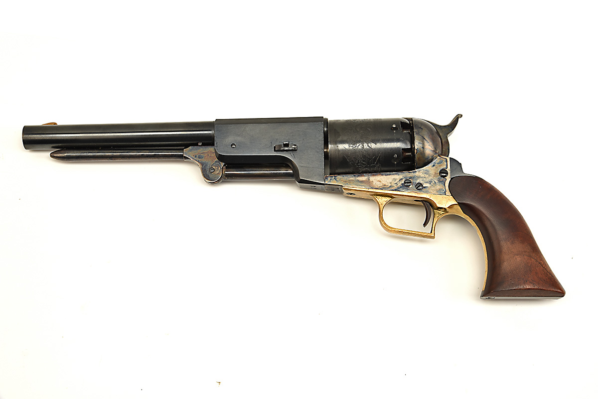 A BOXED REPRODUCTION .44 PERCUSSION ARMI SAN MARCO WALKER COLT REVOLVER, serial no. A85011, with blued two-stage 9in. barrel, colour hardened open iron frame, roll engraved blued cylinder and smooth walnut grip, appearing unfired in its maker's card and foam carton (distressed)