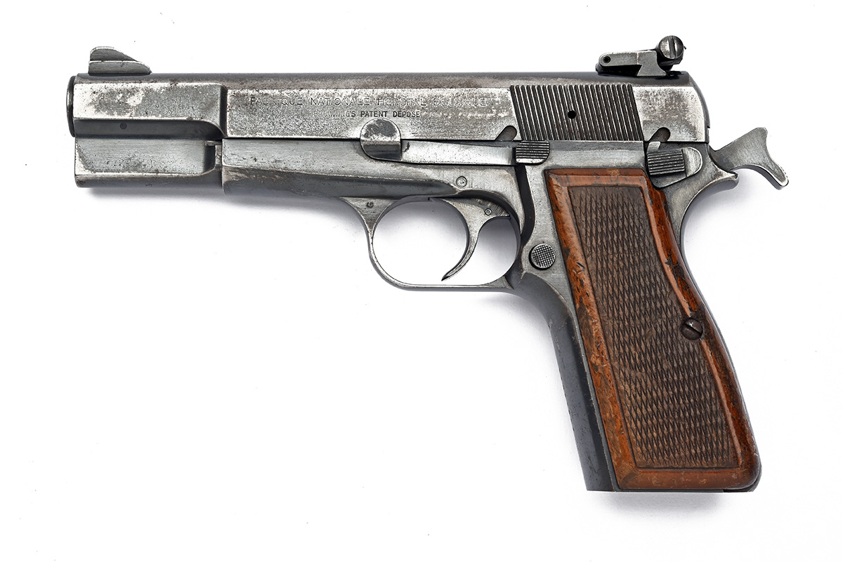 ** A 9mm (PARA) FN BROWNING HI-POWER SEMI-AUTOMATIC PISTOL, serial no. 77C57867, with 4 5/8in. barrel, blued slide and frame, adjustable sights, chequered walnut grips, missing magazine, finish worn