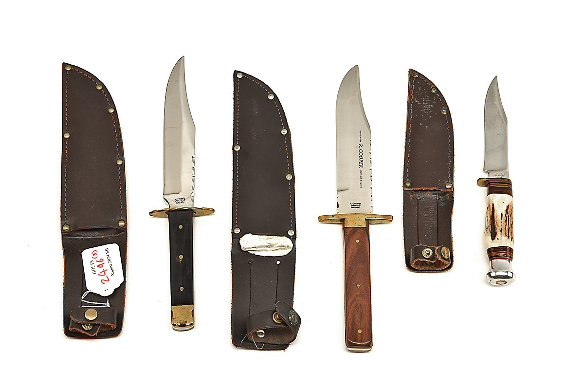 THREE 'R. COOPER' OF SHEFFIELD BOWIE STYLE KNIVES IN LEATHER SHEATHS, approx 4in blade stick tang, brass bolster with wood and antler handle in brown leather sheath