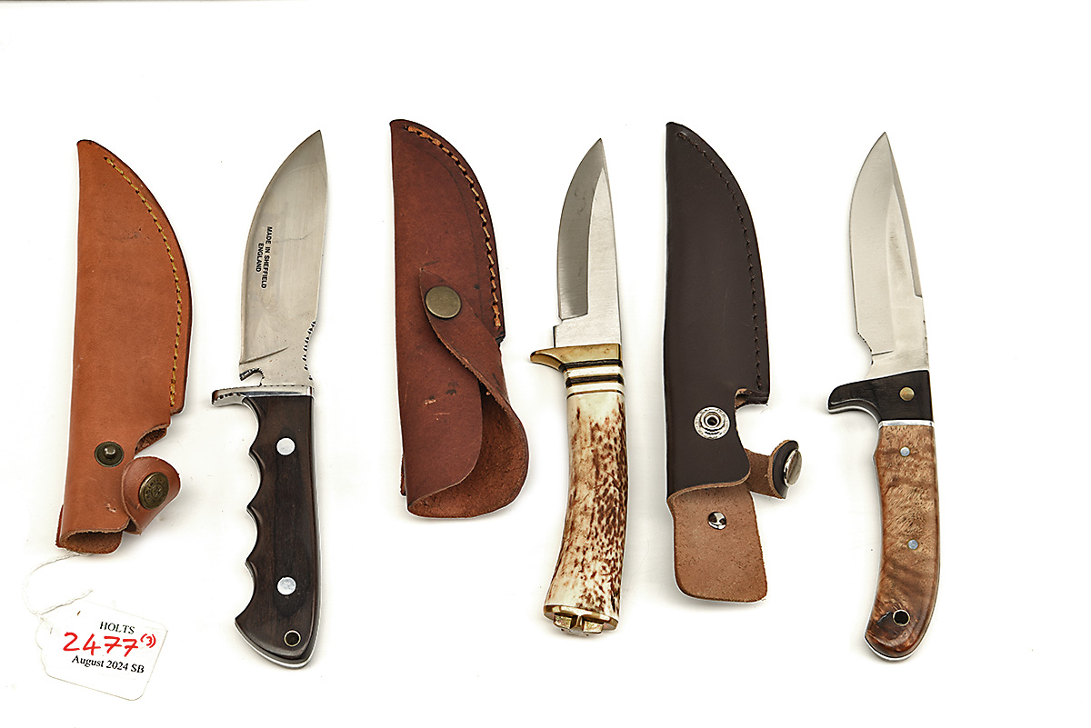 THREE ASSORTED OUTDOOR KNIVES IN LEATHER SHEATHS, approx 4.5in 'MADE IN SHEFFIELD ENGLAND' etched blade, full tang, stainless steel guard with wooden scale handle in tan leather sheath,