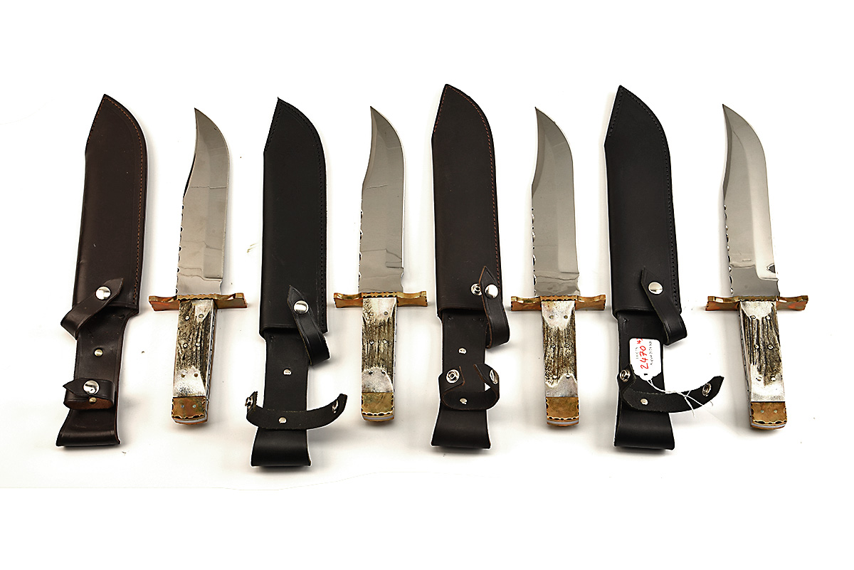 FOUR UNUSED LARGE BOWIE KNIVES IN LEATHER SHEATHS, approx 10in blade, 2 'HAND MADE IN SHEFFIELD WITH BISON' 2 'HAND MADE SHEFFIELD WITH EAGLE' etched on blades, full tang, brass cross guard and pommel, stag antler scale handle in leather sheaths 4