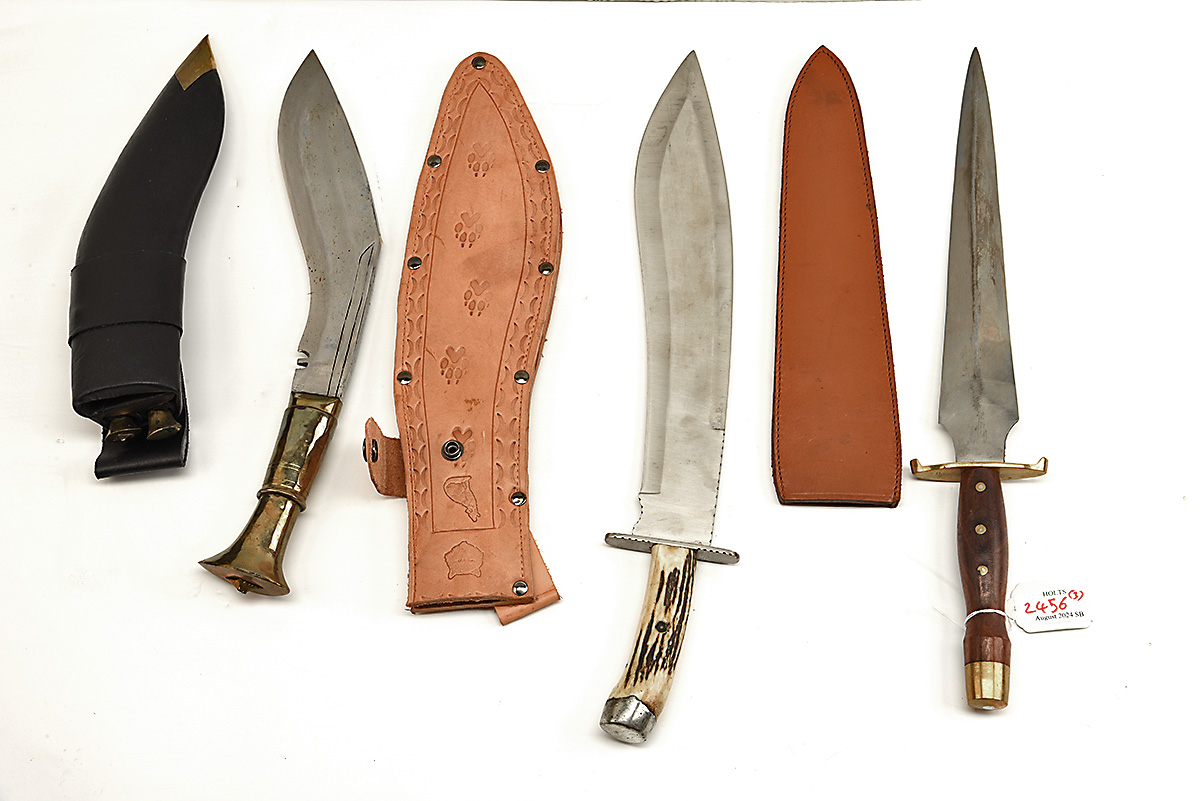 THREE LARGE ASSORTED KNIVES, approx 14in blade machete, half tang, stainless cross guard & pommel, antler handle in tan leather sheath,#