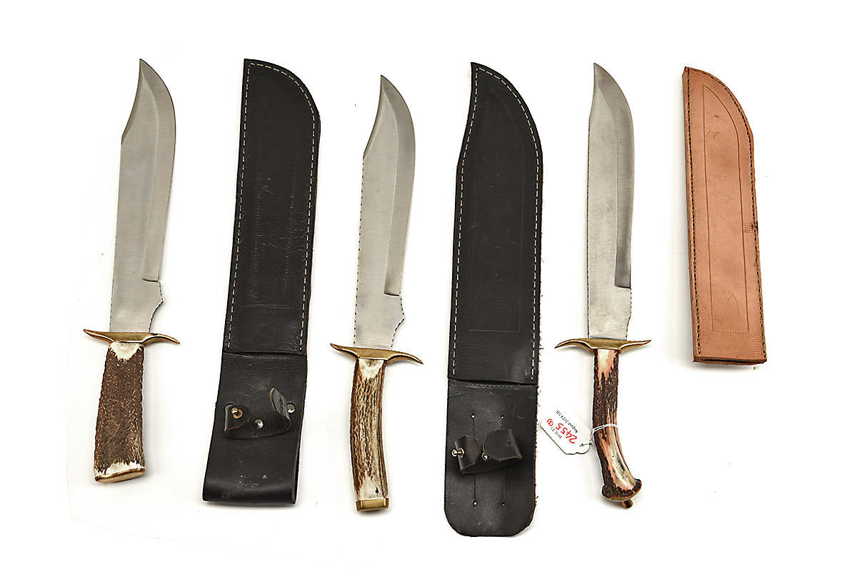 THREE LARGE BOWIE KNIVES IN LEATHER SHEATHS, approx 12in blades, narrow tang, brass cross guard & pommel, stag antler handle, in leather sheaths 3