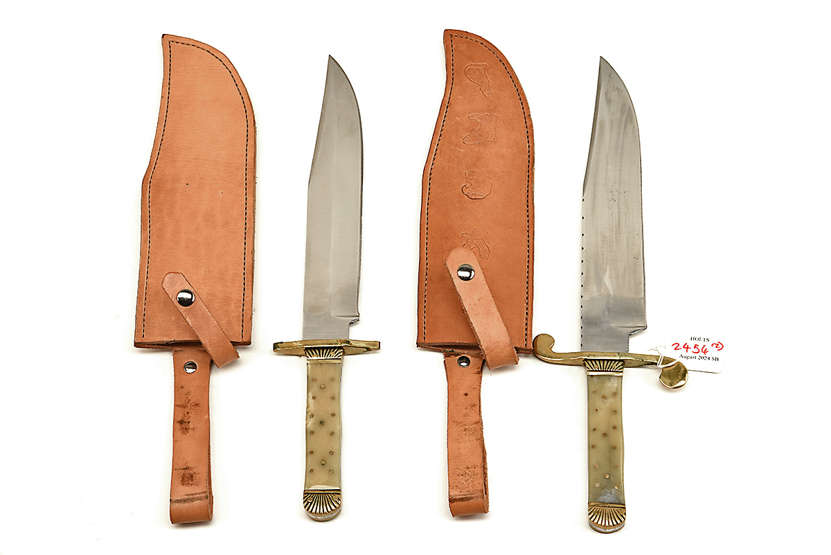 TWO LARGE BOWIE KNIVES IN TAN LEATHER SHEATHS, approx 10in blades, full tang, brass half guard & pommel, horn scale handle in tan leather sheaths 2