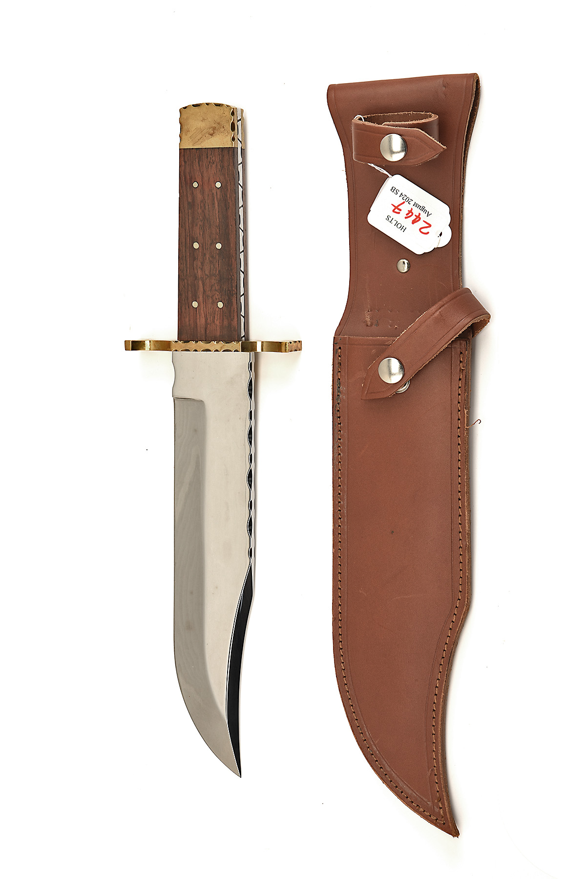A LARGE 'A. WRIGHT & SON' BOWIE KNIFE IN BROWN LEATHER SHEATH, approx 10in 'A. WRIGHT & SON, SHEFFIELD HANDMADE' etched blade, full tang, brass cross guard & pommel, wood scale handle in brown leather sheath