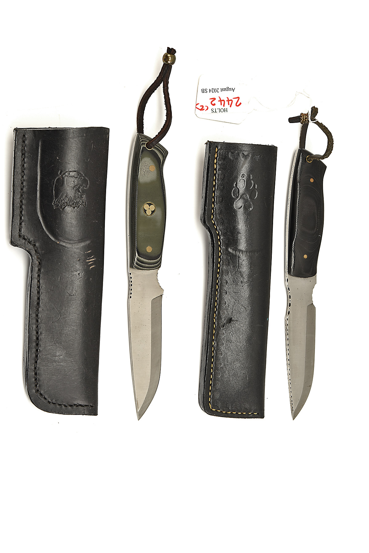 TWO 'ENZO' HUNTING KNIVES IN SHEATHS, approx 4in drop point 'ENZO' etched blades, full tang, micarta handle in black leather sheaths 2