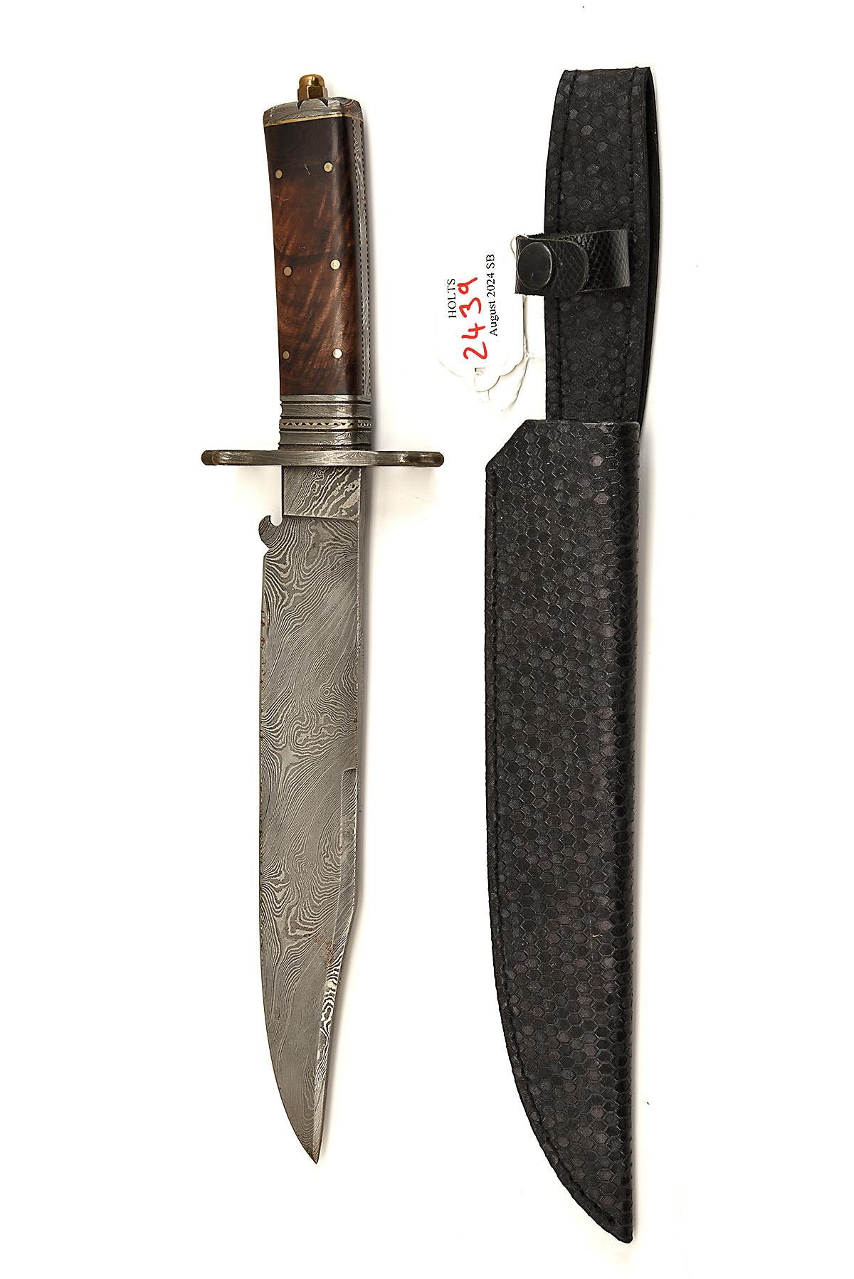 A LARGE DAMASCUS STEEL' BOWIE KNIFE IN LEATHER SHEATH, approx 10in damascus steel blade, full tang, damascus steel cross guard & pommel, wood scale handle in honey comb leather sheath