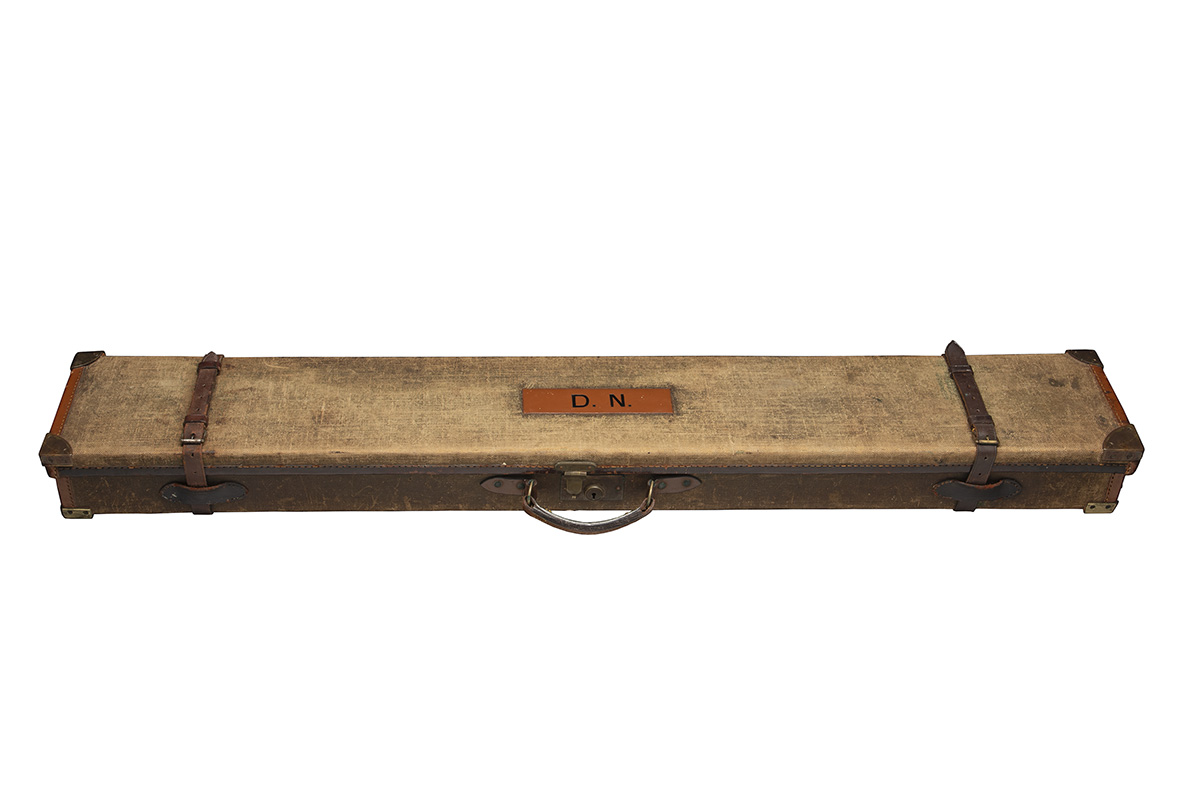 fitted for a rifle measuring approx. 43in. (could adapt to 47in.), the interior lined with maroon baize, a leather gold-tooled William Evans trade label, brass lock (key missing), the lid exterior with the initials 'D.N.'