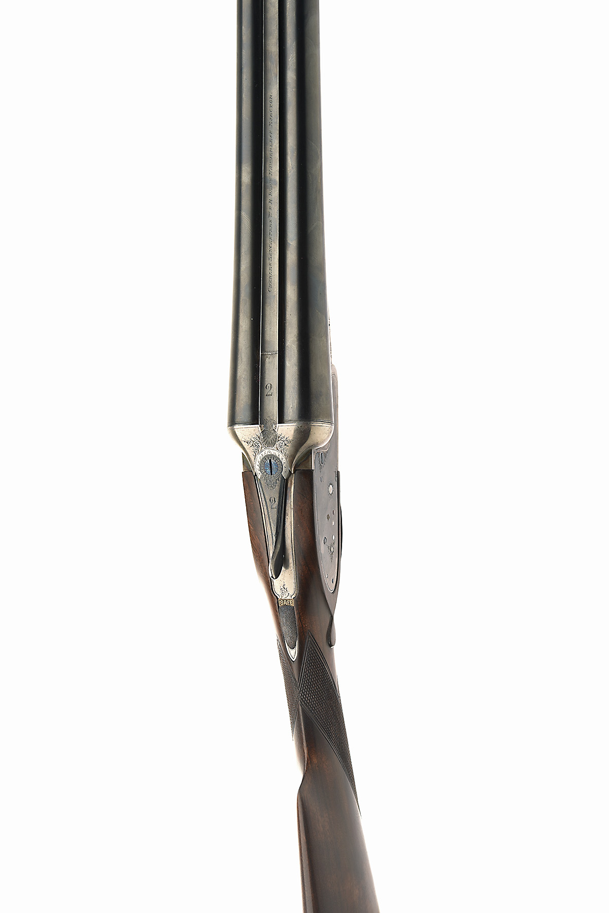 CHARLES LANCASTER A COMPOSED PAIR OF 12-BORE 'CHARLES LANCASTER'S W & R. PLAIN HAMMERLESS EJECTOR' SIDELOCK EJECTORS, serial no. 12276 / 12780, circa 1905 and 1907, 30in. nitro barrels, the ribs engraved 'CHARLES LANCASTER'S W & R. PLAIN HAMMERLESS EJECTOR' and '1' and '2' at the breech ends, 2 1/2in. chambers, bored approx.. true cyl. and 3/4 choke, some internal pits and marks, treble-grip actions with removable striker discs, toplevers engraved '1' and '2', automatic safeties with brass 'SAFE' plaques, border engraving, retaining traces of colour-hardening and some renewed finish, 16 3/4in. figured replacement stock including 1 3/8in. recoil pad (No.1) and 16 3/8in. figured replacement stock (cracks to underhorns) including 1in. recoil pad (No.2), weight 7lb. 4oz., in their brass-cornered leather bound case with Charles Lancaster trade label and some accessories, and together with a leather double gunslip