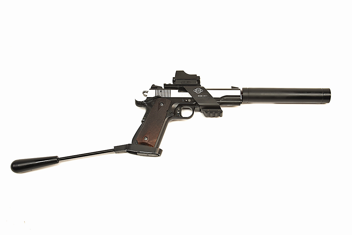 A CASED .22 (L/R) GSG 1911 LONG-BARRELLED PISTOL, serial no. A740891, with 11 7/8in. barrel, built-on dummy sound moderator, blacked frame, the slide with brushed bright sides, chequered woodgrain effect grips and permanent wrist-brace to rear, fitted with a Sight Mark reflex sight, in its maker's abs plastic carry-case with two new spare magazines together with some tools and spares