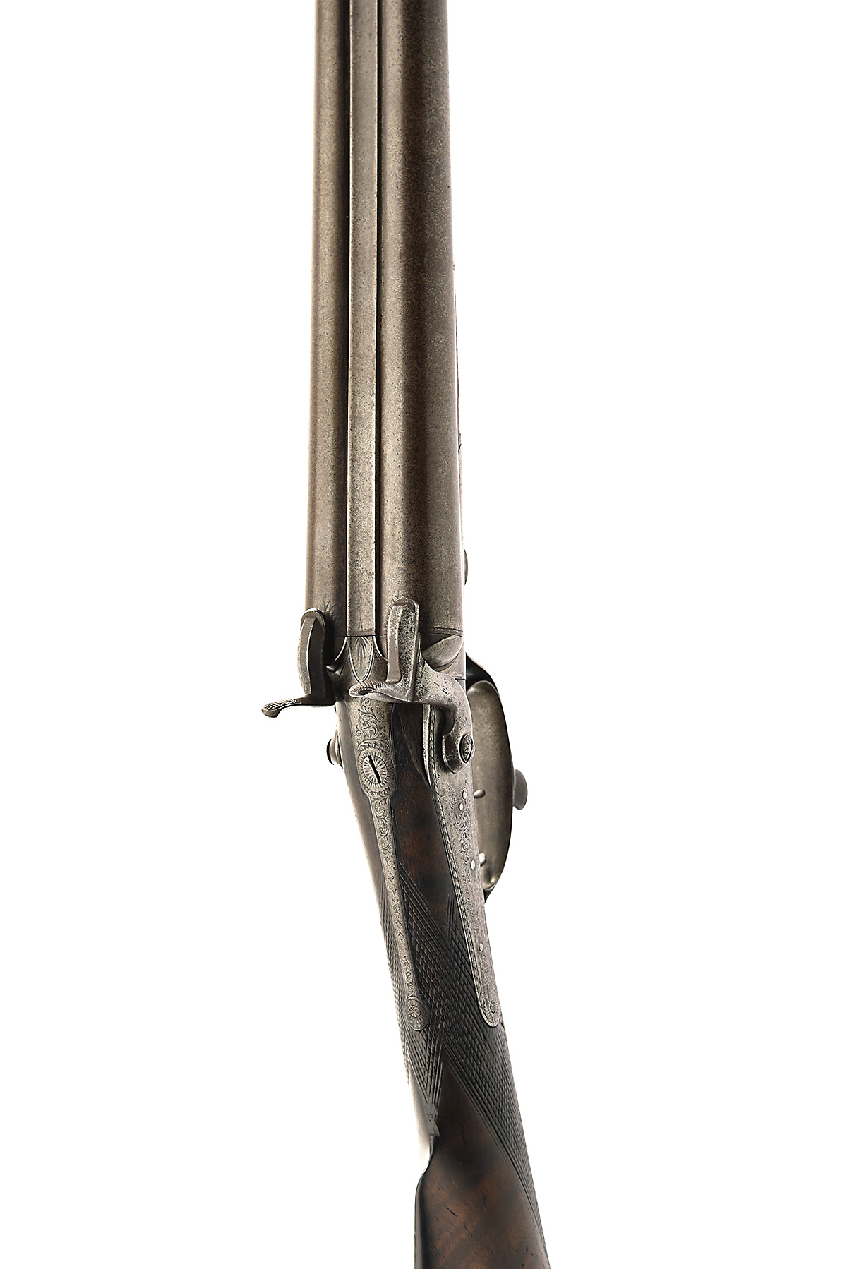 A CASED 12-BORE PINFIRE DOUBLE-BARRELLED SPORTING-GUN SIGNED McLOUGHLIN, no visible serial number, with fine damascus 29 3/4in. unsigned barrels, rounded action with swing under-lever, border and scroll engraved back-action locks signed 'McLOUGHLIN', chequered walnut butt-stock and splinter fore-end, in its probable original black canvas-covered trunk case of muzzle-loading style