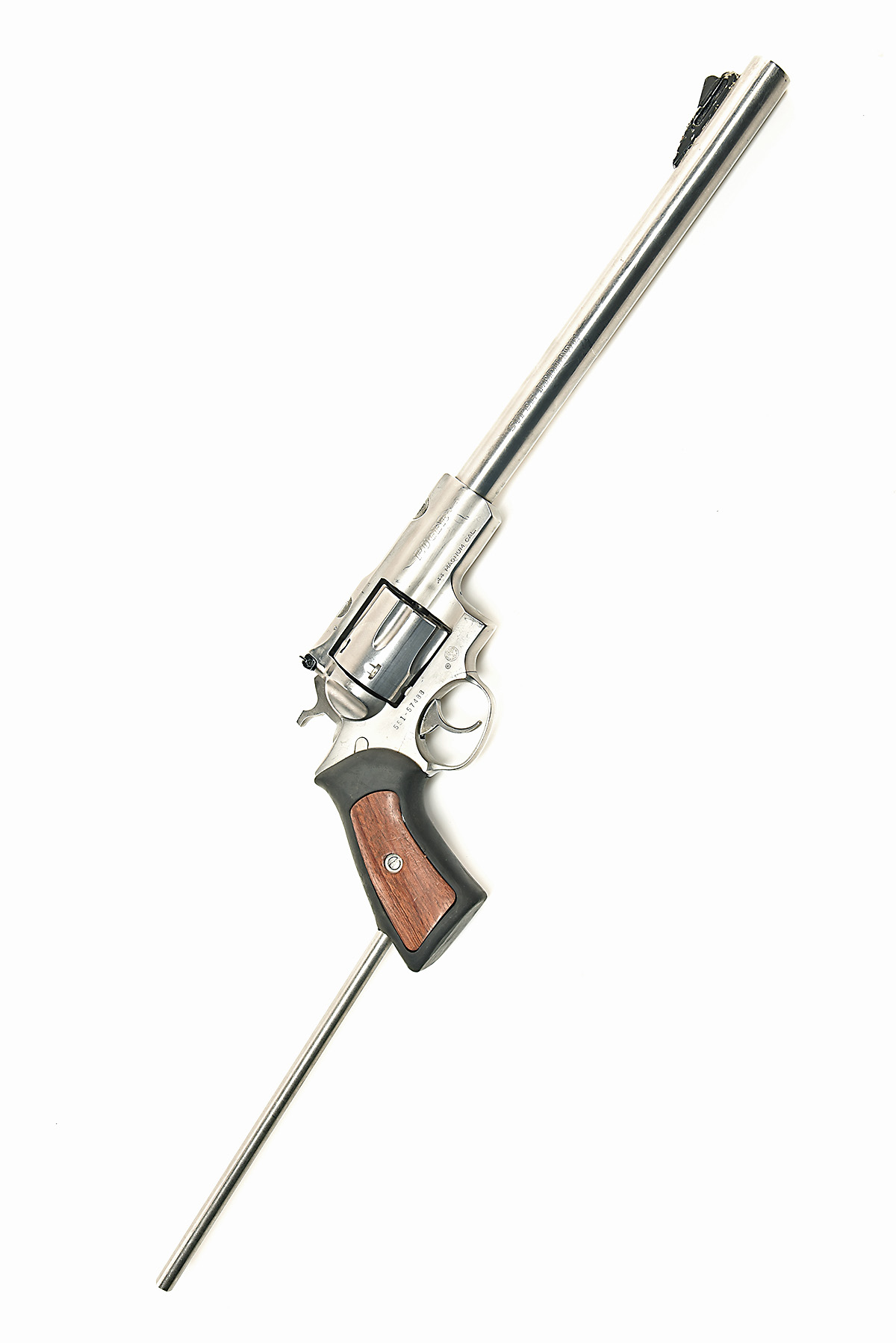 A .44 (MAG) RUGER SUPER REDHAWK LONG-BARRELLED REVOLVER, serial no. 555-57488, with stainless 12in. barrel, solid frame with integral telescopic sight mounting points, swing-out fluted cylinder, factory rubber grips with wood inlays and permanent extension bar to rear