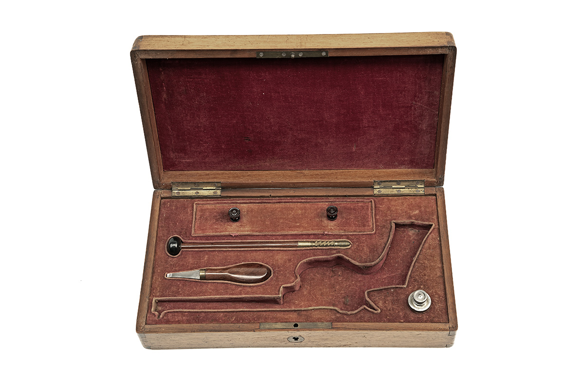 Belgian market, measuring externally 12 1/4in. x8 1/2in. x 3in., lined in the Continental manner in red velvet (faded) for a 7mm Lefaucheux style revolver with folding trigger and approximately 6in. barrel, complete with turn-screw, cleaning rod, oil bottle and lidded ammunition compartment, no key