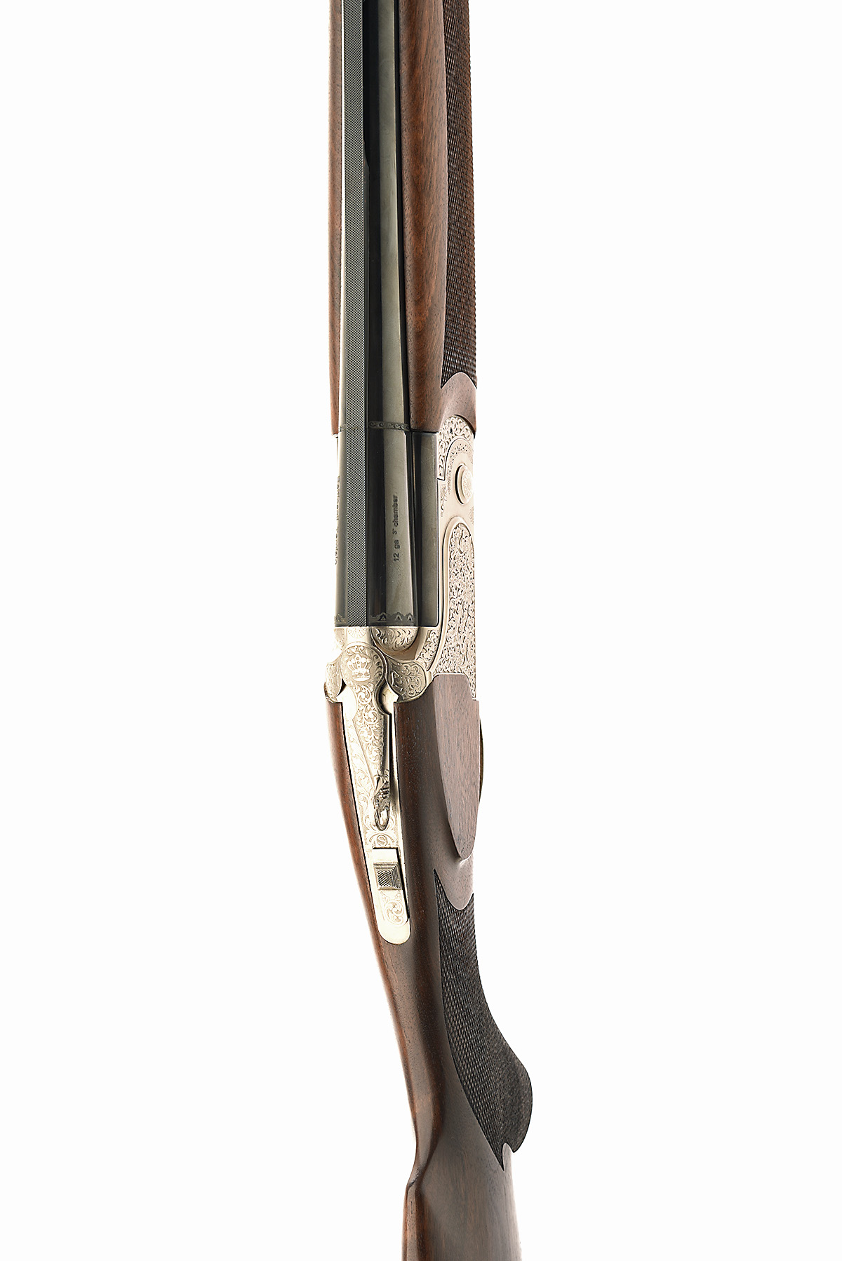 BETTINSOLI TARCISIO 12-BORE 'OVERLAND PRINCE OF WALES' SINGLE-TRIGGER OVER AND UNDER EJECTOR, serial no. 188093, dated 2003, 27 1/2in. nitro barrels with 7mm ventilated matt top-rib, 3in. chambers, multichokes (no spares), pierced hold-open toplever, manual safety with integral barrel selector switch, gold-washed single trigger, carved in relief with floral scrollwork set on a matt background, 14 1/4in. semi-pistolgrip stock including 1/4in. wooden extension, weight 6lb. 4oz.