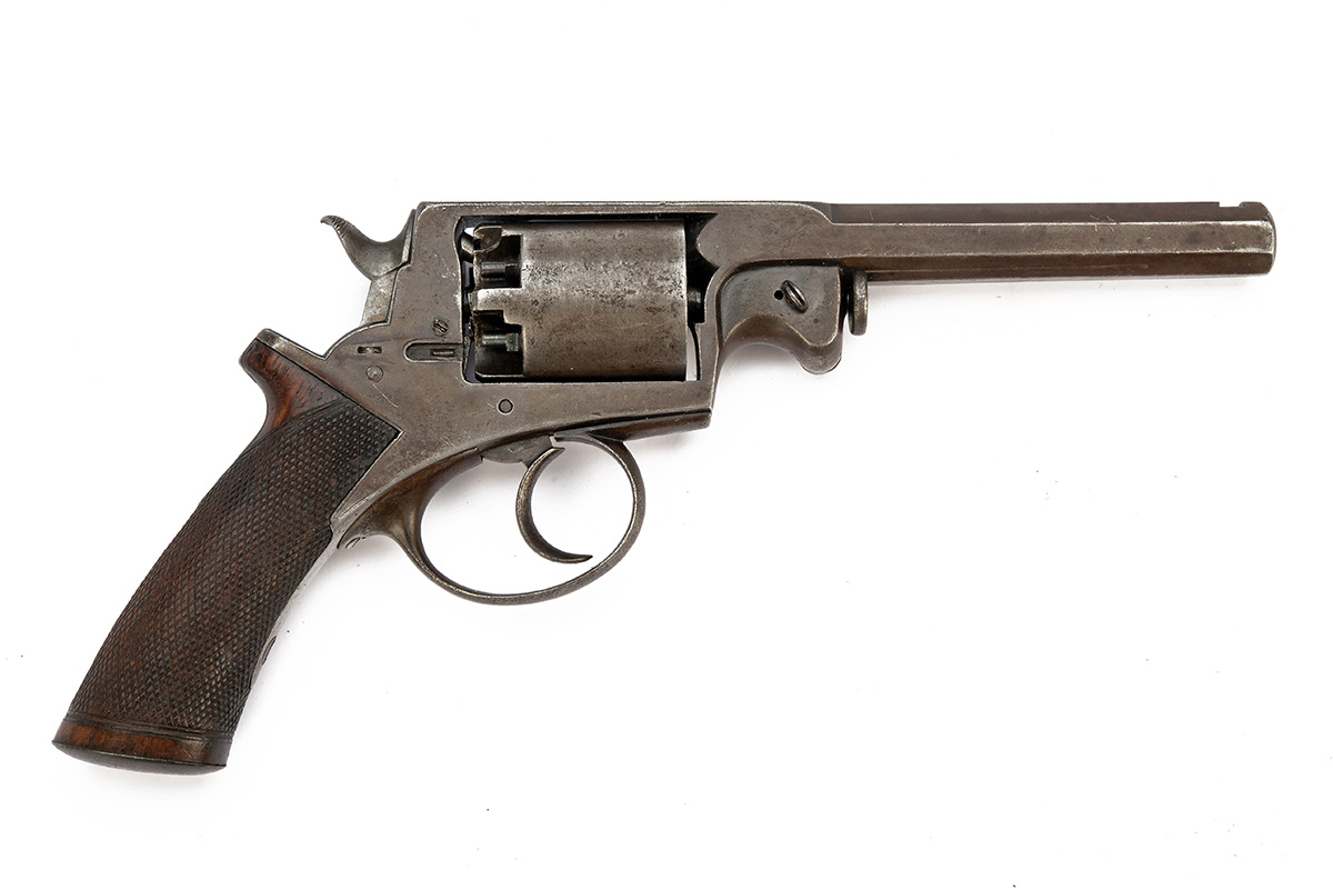 * A 54-BORE PERCUSSION ADAMS PATENT REVOLVER, no visible serial number. circa 1858, with octagonal 5 3/4in. barrel, solid frame, five-shot cylinder and semi saw-handled walnut grip, finish worn, replacement rammer and missing safe slide
