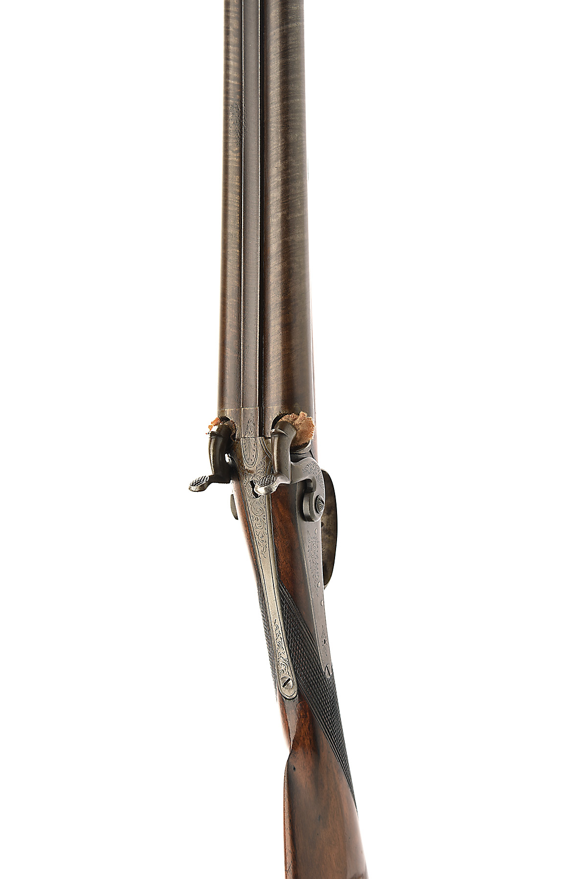 A 14-BORE PERCUSSION DOUBLE-BARRELLED SPORTING-GUN, UNSIGNED, no visible serial number,