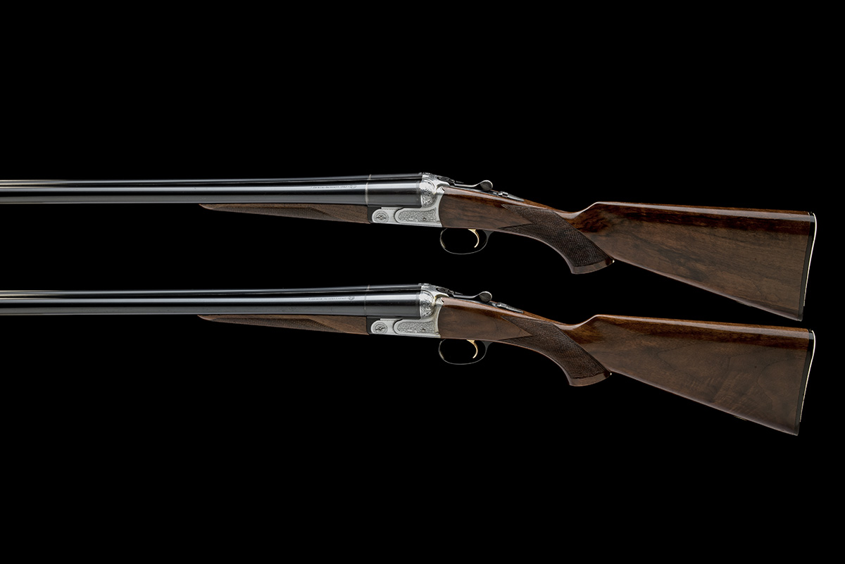 for 1988, 28in. nitro barrels (No.1 missing short rib), 2 3/4in. chambers, bored approx. 1/4 and 3/4 choke (No.1) and 1/4 and 1/2 choke (No.2), automatic safeties with engraved 'S' details and integral barrel-selector switches, gold-washed triggers, acanthus scroll engraving with floral bouquets, old silver and blued finish overall, 14 1/4in. pistolgrip stocks including trademark buttplates, weight 6lb. 6oz.