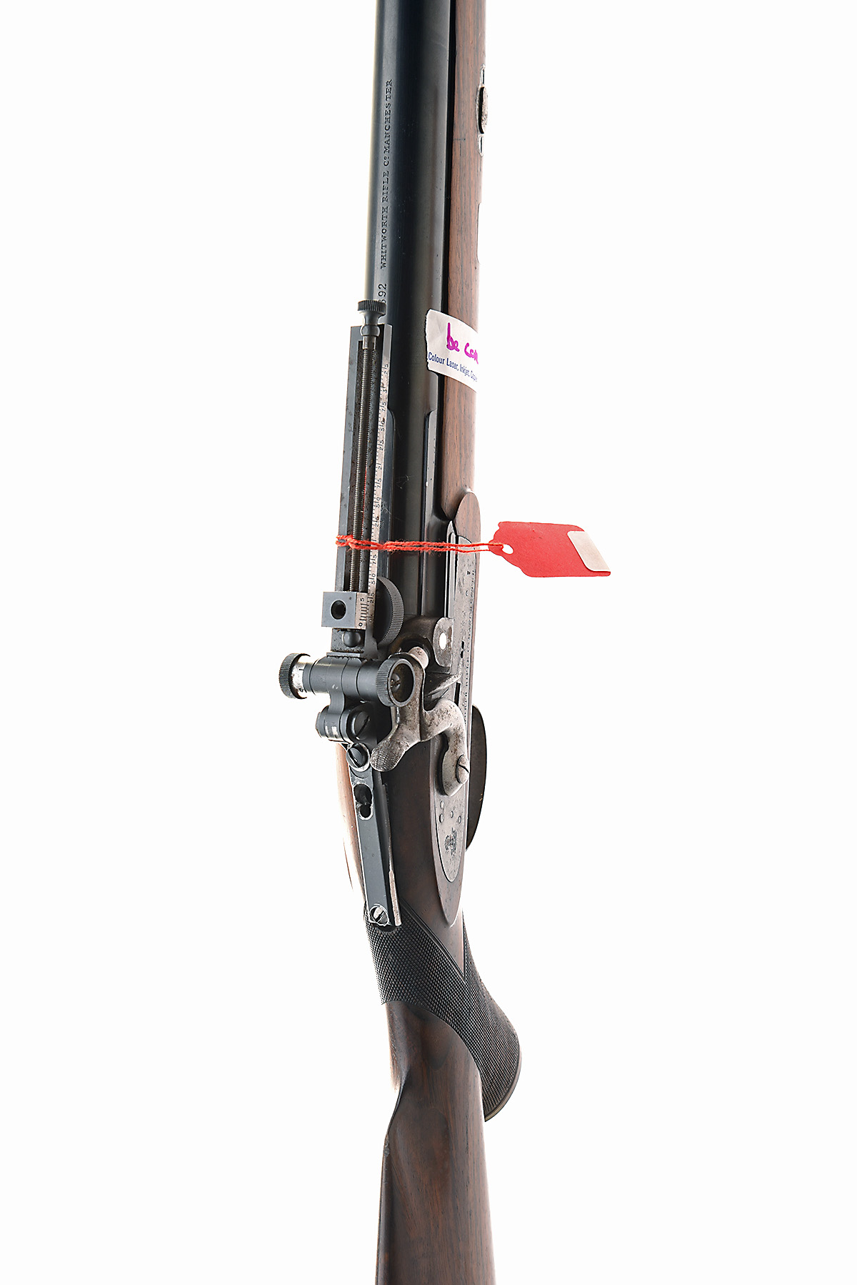 A REPRODUCTION WHITWORTH RIFLE CO. .451 (WHITWORTH) PERCUSSION MATCH RIFLE, serial no. C892, replacement barrel circa 1990, 36in. black powder only reproved (in 2024), aperture fore-sight, the top engraved 'C892. WHITWORTH RIFLE CO. MANCHESTER.', numbered on the underside '75609', Whitworth Rifle Co, Manchester lock, missing the hammer safety and with replacement hammer, top-tang poorly fitted with a folding aperture rear-sight, pistolgrip halfstock with pistolgrip cap, horn fore-end finial, 13 1/2in. pull including steel buttplate, sling eyes, weight 11lb.