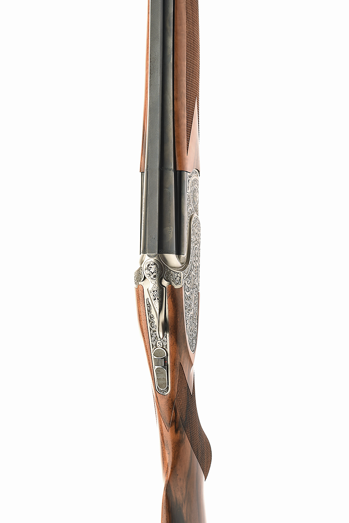 CAESAR GUERINI 12-BORE (3IN.) 'MAXUM' SIDEPLATED SINGLE-TRIGGER OVER AND UNDER EJECTOR, serial no. 134640, for 2013, 29 7/8in. (76cm) high performance steel proof nitro barrels, raised solid tapered matt rib, 3in. chambers, multichokes (with spares), hold-open toplever, manual safety with integral barrel selector switch, bold acanthus scroll engraving on a matted ground, the triggerplate signed 'Bottega C. Giovanelli', 14 7/8in. figured semi-pistolgrip stock including wooden buttplate, weight 7lb. 8oz., in its universal case with card outer