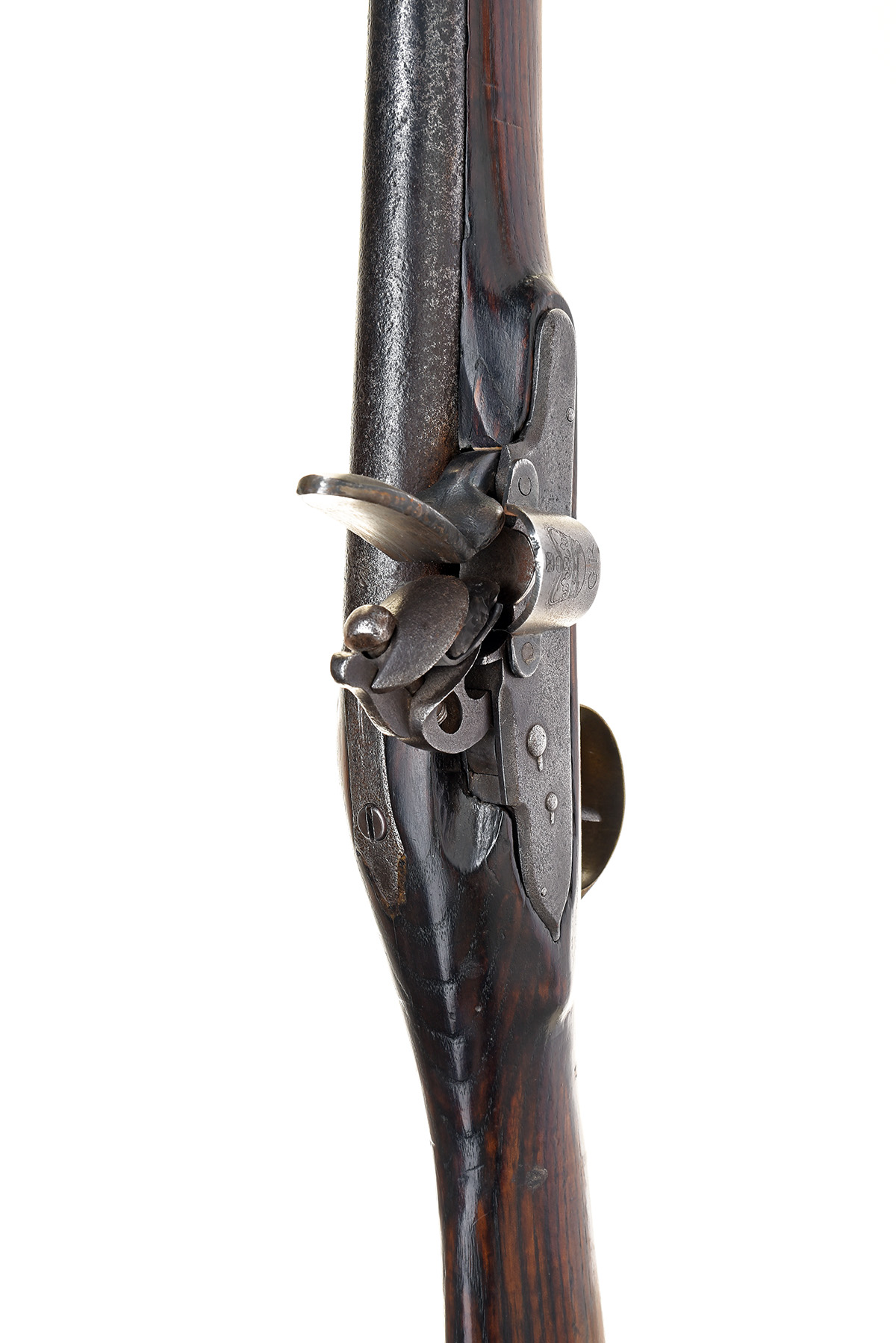 A .750 FLINTLOCK CARBINE WITH NOCKS SCREWLESS LOCK, SIGNATURE ILLEGIBLE, no visible serial number,