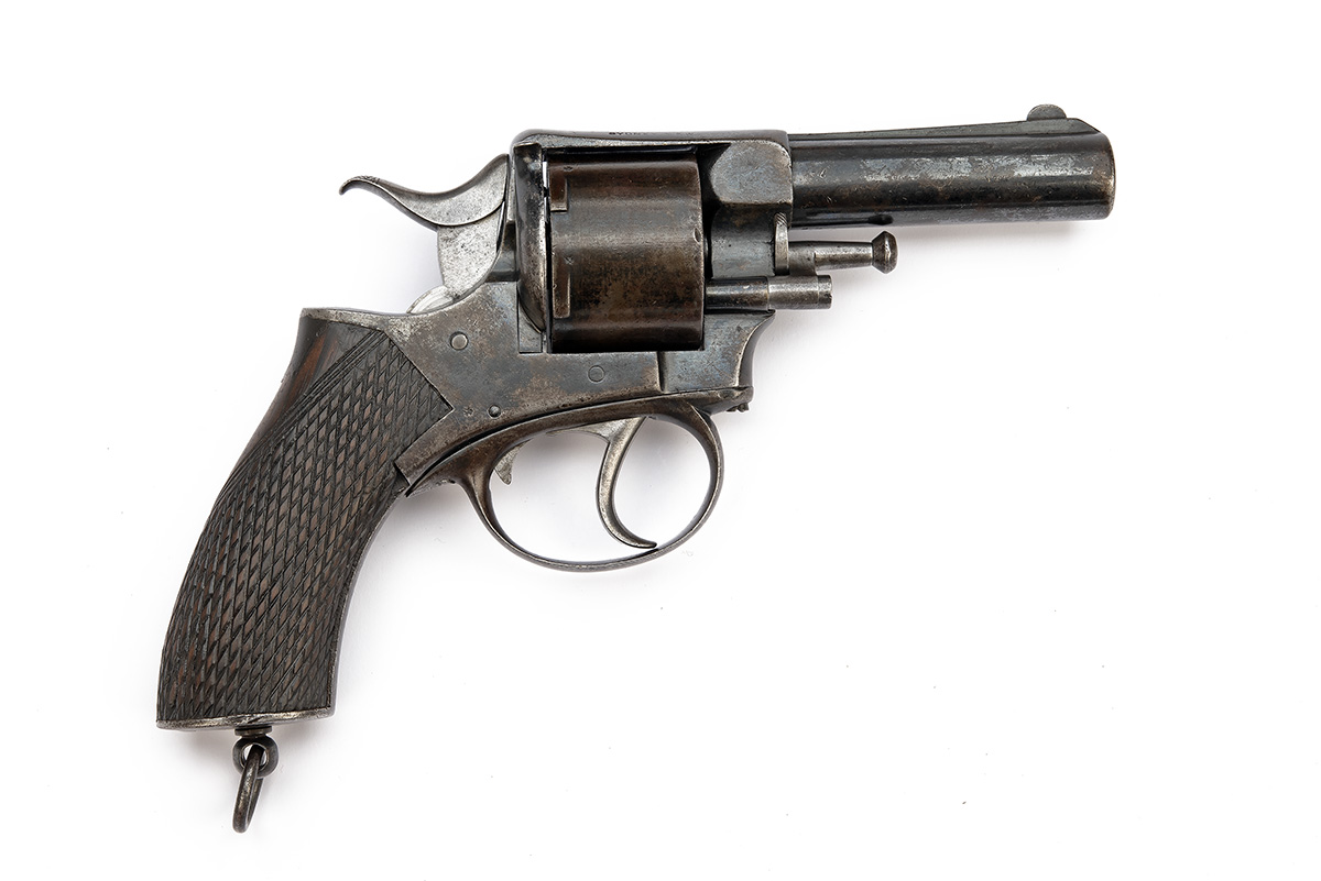 circa 1875, with blued round 3 1/2in. barrel, moulded ramped sighting rib with crescent fore-sight, hump-backed top-rib with sighting groove and signed 'C. COWLES SIDNEY, N.S.W.', solid frame with Webley markings, plain six-shot cylinder with external ratchet locking, chequered walnut grip, lanyard ring at heel and double action mechanism, in a similar period oak case lined and compartmented in blue baize with fitted ammunition tray