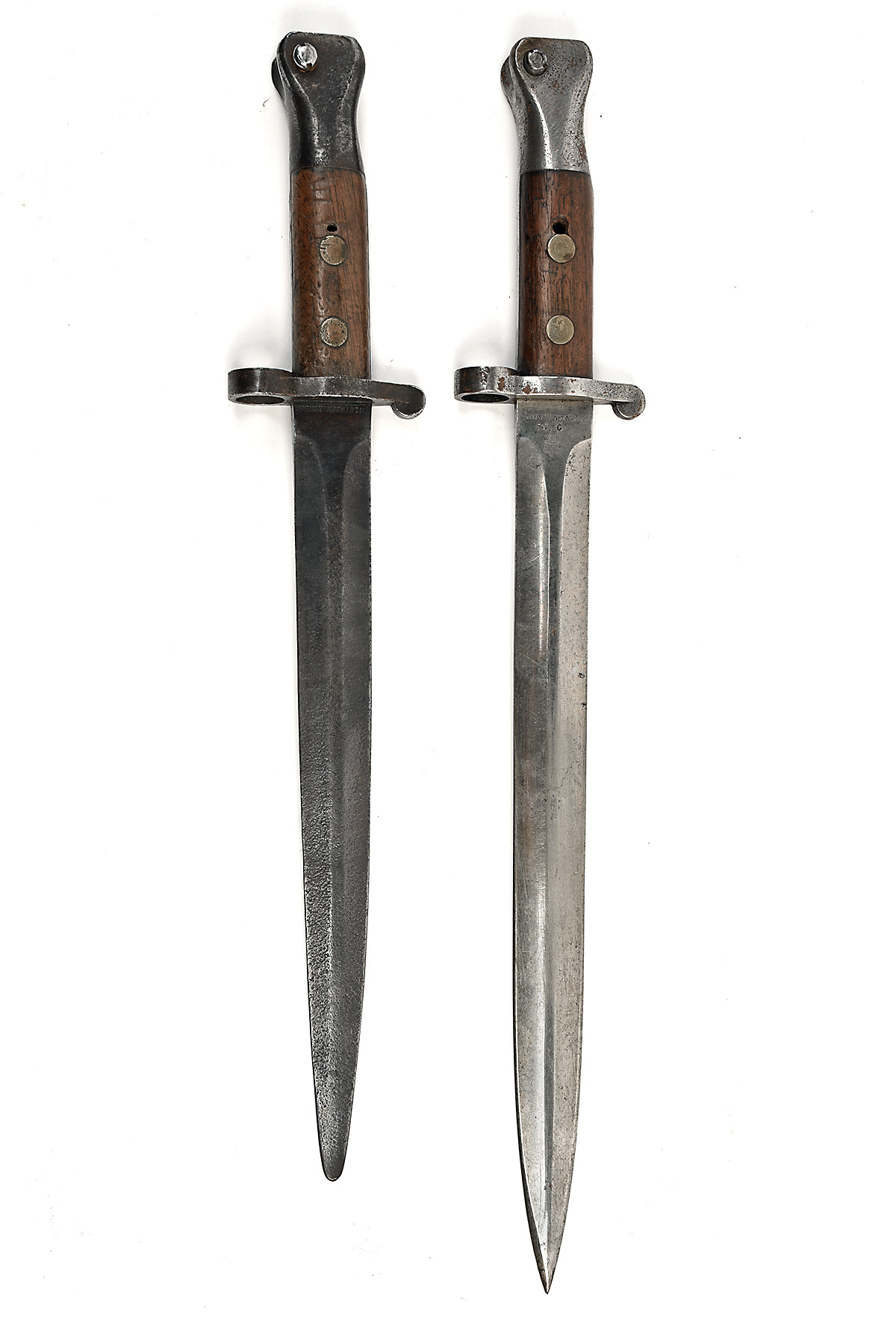 A PAIR OF PATTERN 1888 MARK I SECOND TYPE SWORD BAYONETS BY WILKINSON, dated 1890, with 12 in. double-edged steel blade, ricasso marked Wilkinson, London, with Broad Arrow, WD, Enfield inspection mark and bend test 'X' over, wooden grips, cross-guard and hilt with blinded pitting, 16 1/2 in. overall, together with another, with heavily pitted blade shortened to 10 1/2 in. ricasso marked Wilkinson, London, no other visible marks, no scabbards