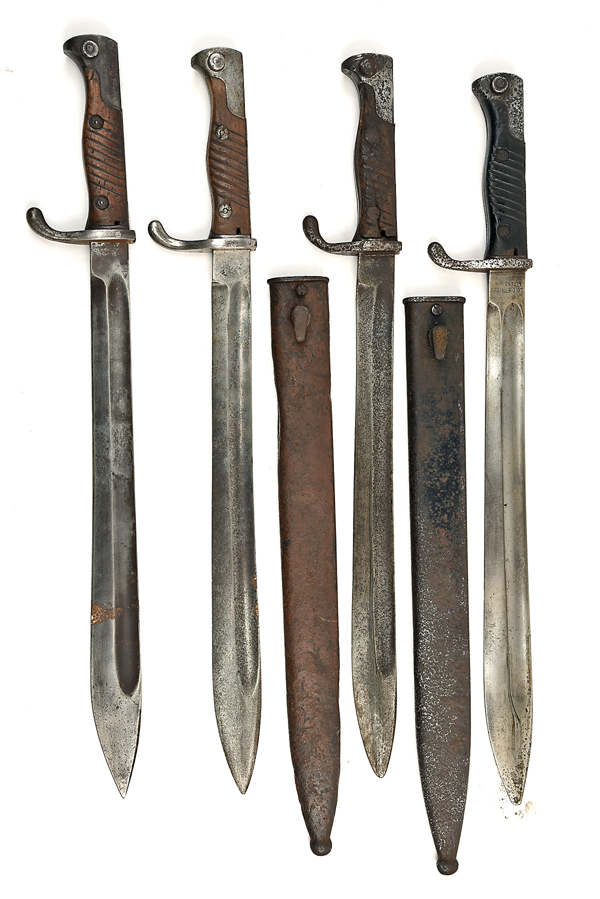 A GROUP OF FOUR GERMAN WORLD WAR I MODEL 1895/05 PIONEER 'BUTCHER' BAYONETS WITH SAWBACKS REMOVED, early 20th Century, with 14 1/2 in. single-edged blades fullered on each side, quillioned cross-guards, steel hilts with two-piece wooden grips, being; 1) ricasso marked 'Walter & Co. / Mulhausen in Thr.', worn, stained with blinded pitting and rust patches, no scabbard; 2) ricasso marked 'ALEX COPPEL / SOLINGEN', worn, stained with blinded pitting and rust patches, no scabbard; 3) ricasso marked 'LO. DIETRICH / ALTENBURG' with 'GEBR. HARTKOPF / SOLINGEN' over, black stained grips, with scabbard, worn and exposed metalwork heavily pitted, bladed tip missing, release button frozen, scabbard rusted and dented; 4) semi-relic with scabbard, rusted and heavily pitted, no visible markings, losses and damage to grips, scabbard dented and split