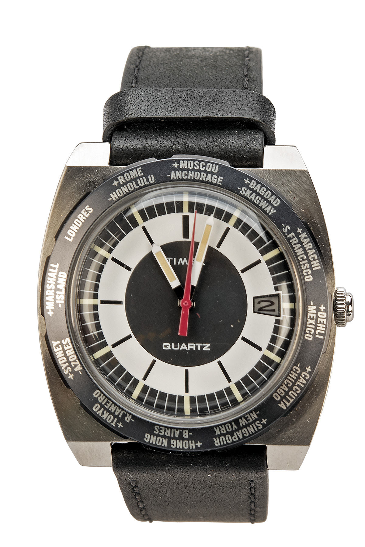 A BOXED TIMEX 'WORLD TIME 1972 REISSUE' WRISTWATCH, a tribute to Timex Model 41 from the 1970's, 39mm barrel shaped stainless steel case, 12mm height, high contrast black and white dial with oversized bi-directional rotating bezel marking Greenwich Mean Time and 23 cities from different time zones with French spelling, geometric red second hand, domed acrylic crystal, date window at 3 o'clock, in its original box with paperwork and swing tag
