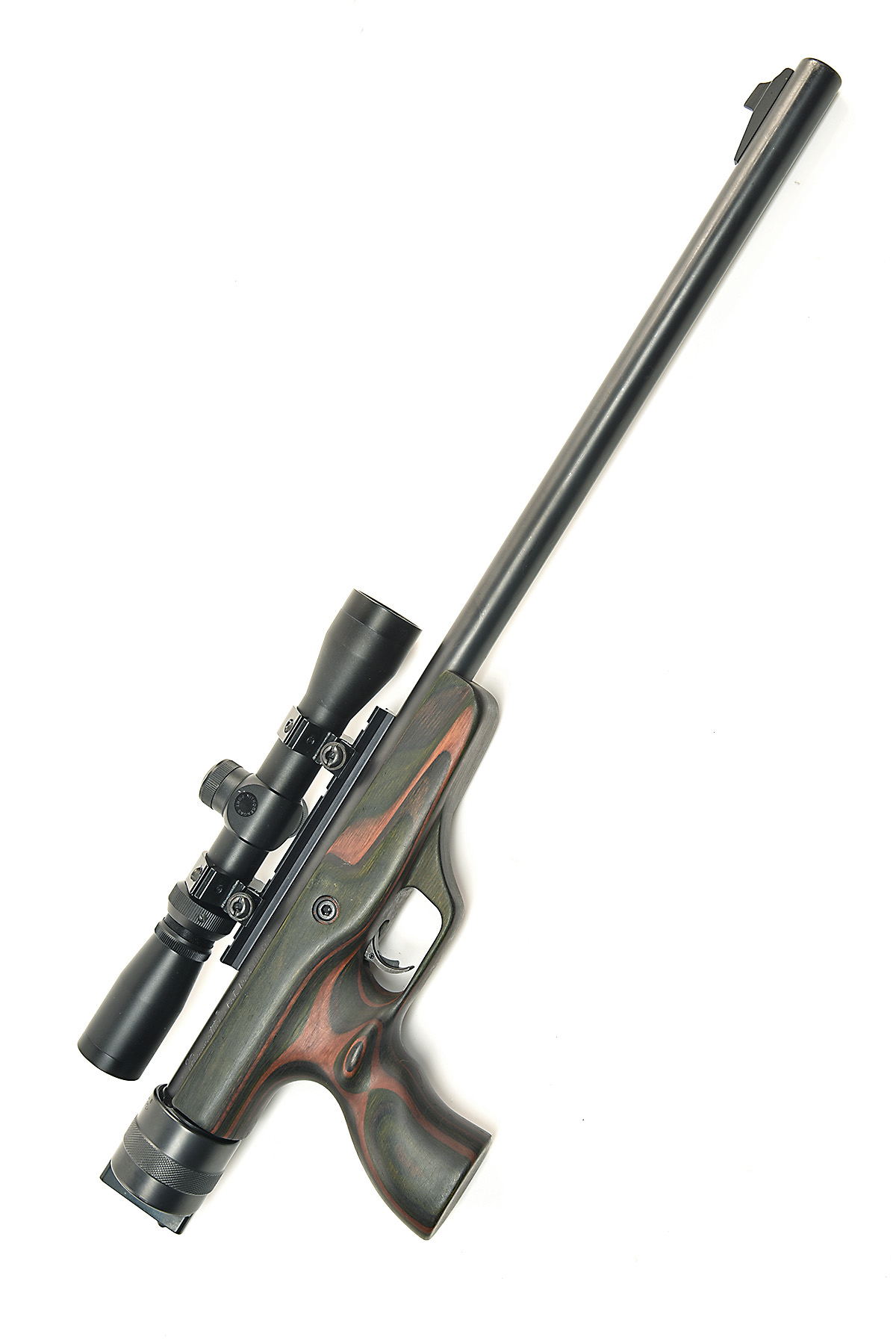 A .454 (CASULL) COMPETITOR CORP LONG BARRELLED PISTOL, serial no. 015863, with 23in. blacked barrel, telescopic sight mount, twist-to open breech at rear, brown/green laminated wood grip and fitted with an unsigned 2-7x32 pistol telescopic sight, appearing little used