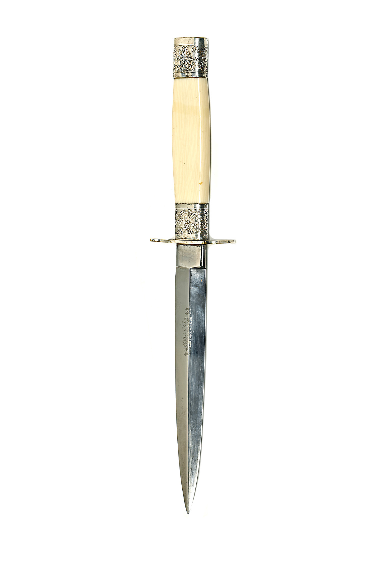 A 'JOHN NOWILL & SONS' ORNATE DAGGER WITH LEATHER SHEATH, approx. 6in. blade double edge dagger blade, stick tang, steel cross guard, faux ivory or bone handle, ornate embossed pommel & bolster in brown leather sheath