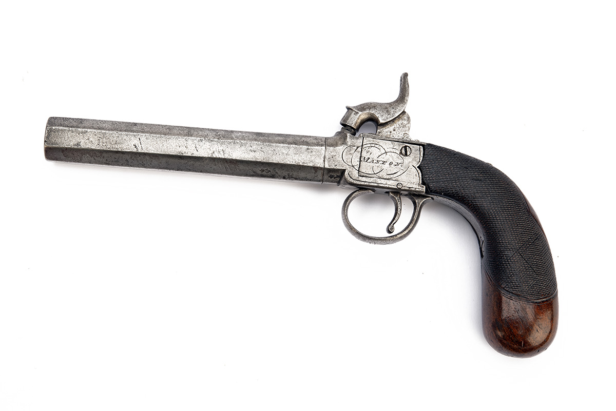 A 32-BORE PERCUSSION BOXLOCK OVERCOAT PISTOL SIGNED MANTON, LONDON, no visible serial number, with turn-off octagonal 5 1/8in. barrel, squared central hammer boxlock action signed 'MANTON, LONDON, guarded trigger and chequered bag-shaped grip