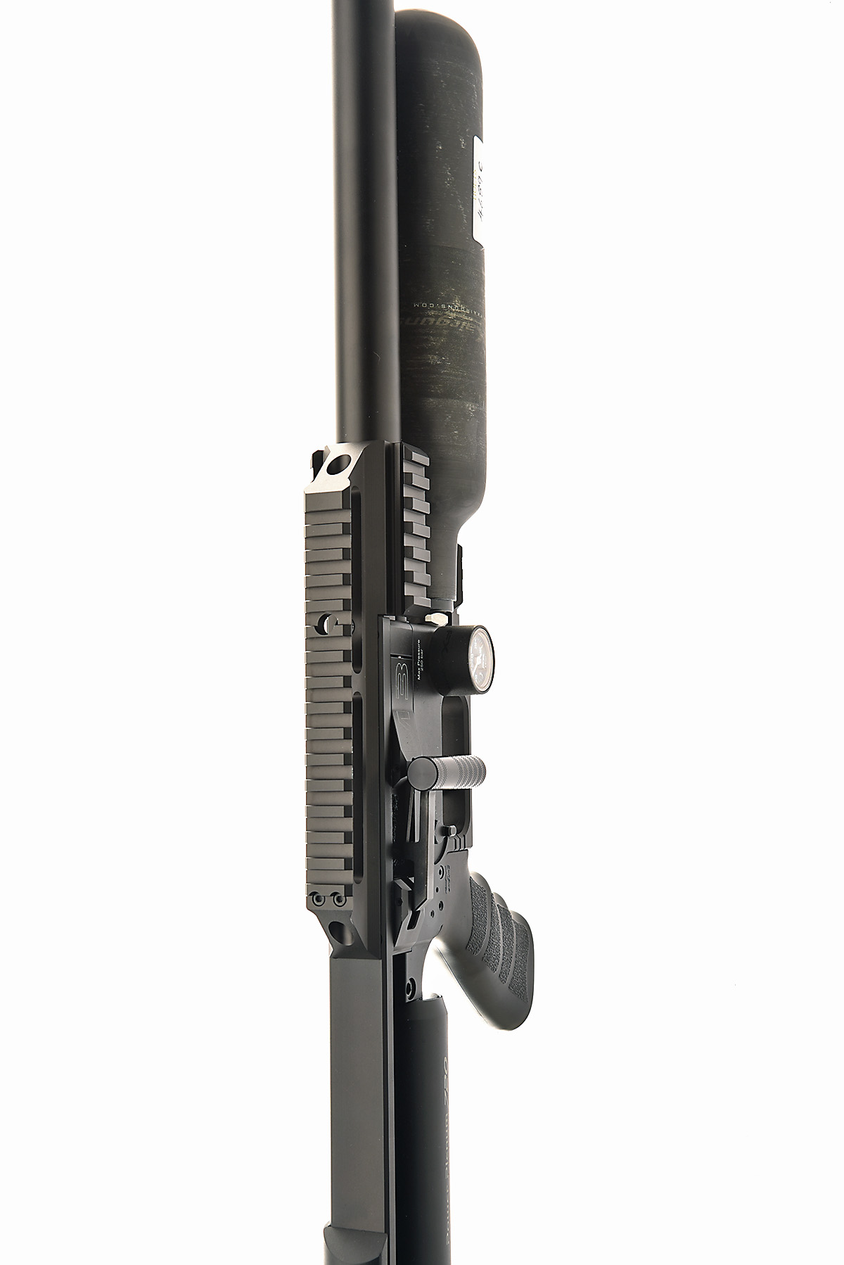 with 30in. barrel including sound moderator, lever-action receiver with detachable rotary magazine housed in machined alloy butt-stock, soft rubber pistol-grip, carbon fibre-covered air-chamber, appearing little used (tested), in its makers abs flight case with instructions, filling adaptor and spare magazine