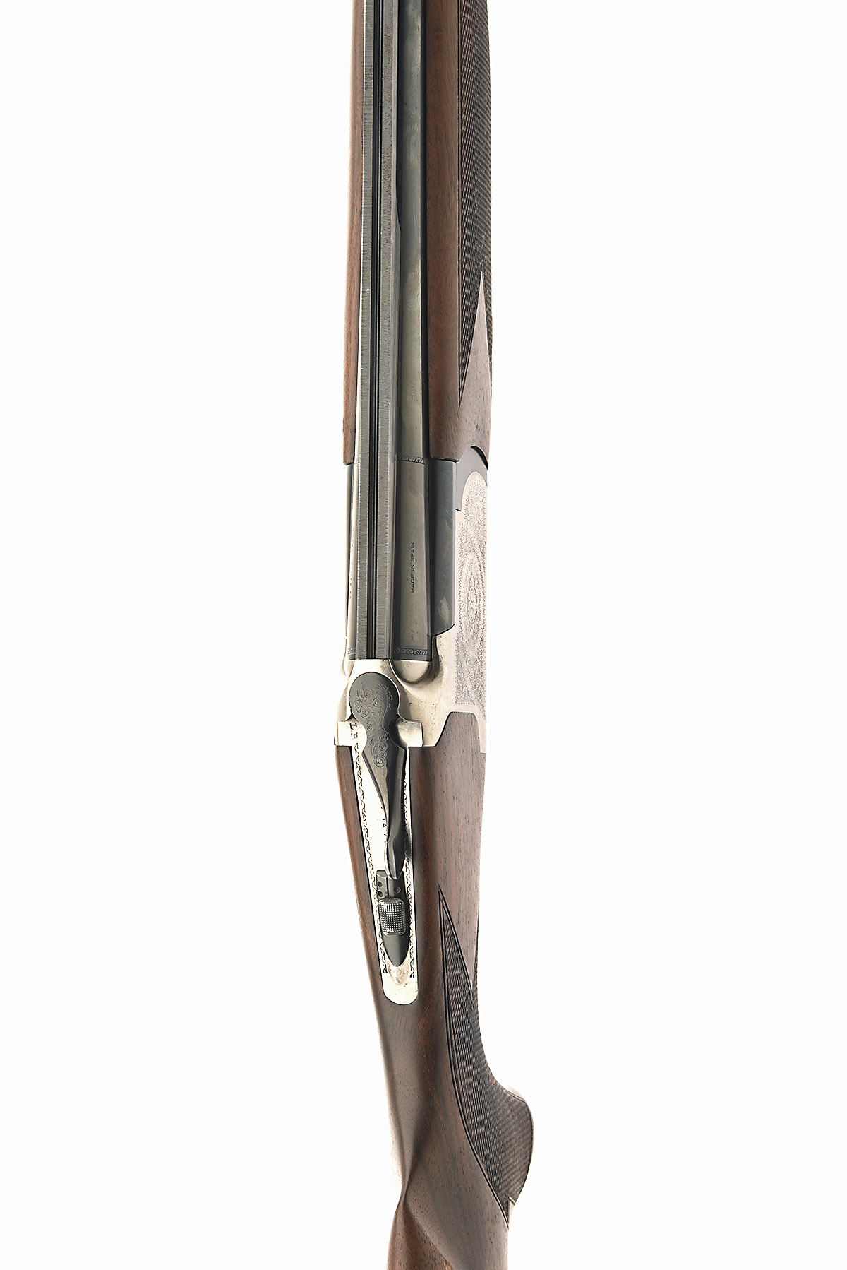 LANBER 12-BORE SINGLE-TRIGGER OVER AND UNDER EJECTOR, serial no. 304395, for 1989, 27 1/2in. (70cm) nitro barrels with 10mm ventilated matt top-rib, ventilated mid-rib, 2 3/4in. chambers, multichoke (with spares), hold-open toplever, manual safety with integral barrel-selector switch, gold-washed trigger, acanthus scroll and floral bouquet engraving, bright and blued finish, 14 1/4in. pistolgrip stock including rubber recoil pad