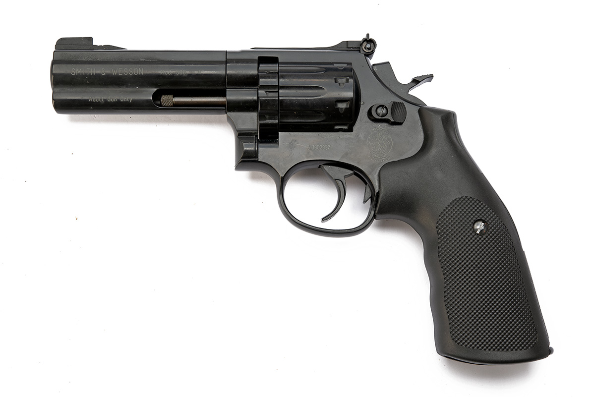 A CASED .177 SMITH & WESSON CO2-POWERED AIR REVOLVER, serial no. S13802837, with blued 4in. barrel, rotary magazine, blued frame, chequered soft touch grip, in its maker's abs plastic carry case with some accessories (untested)