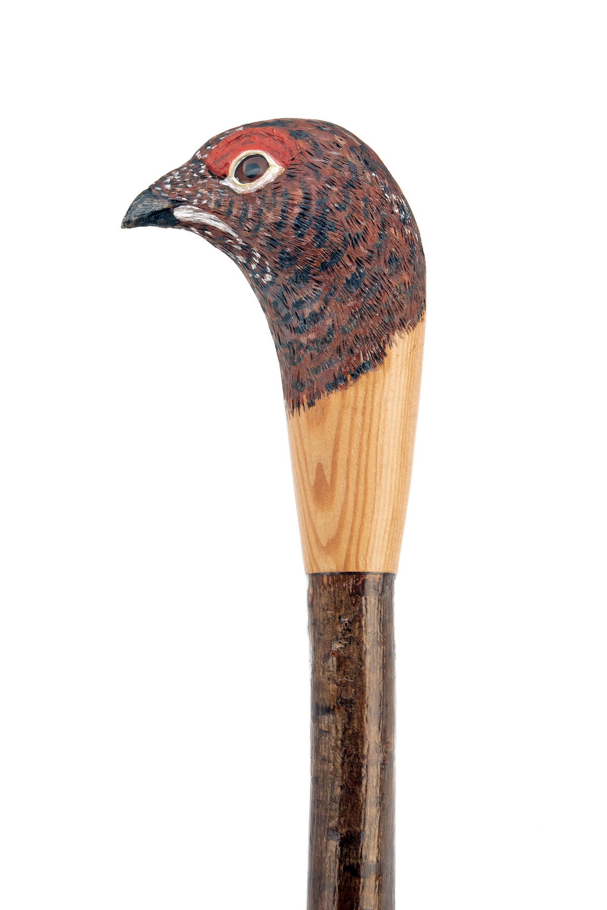 A MARK RICHARDS HAND-CARVED SPORTSMAN'S STAFF, with ashwood type shaft, the top carved in the form of ptarmigan, measuring approx. 52in. in length