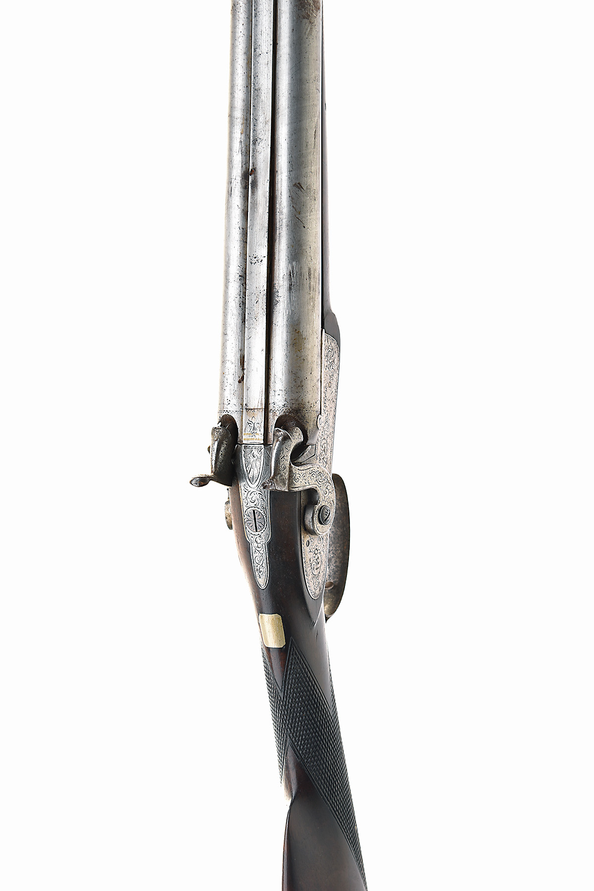 A 12-BORE PERCUSSION DOUBLE-BARRELLED SPORTING-GUN SIGNED SMITH, no visible serial number,
