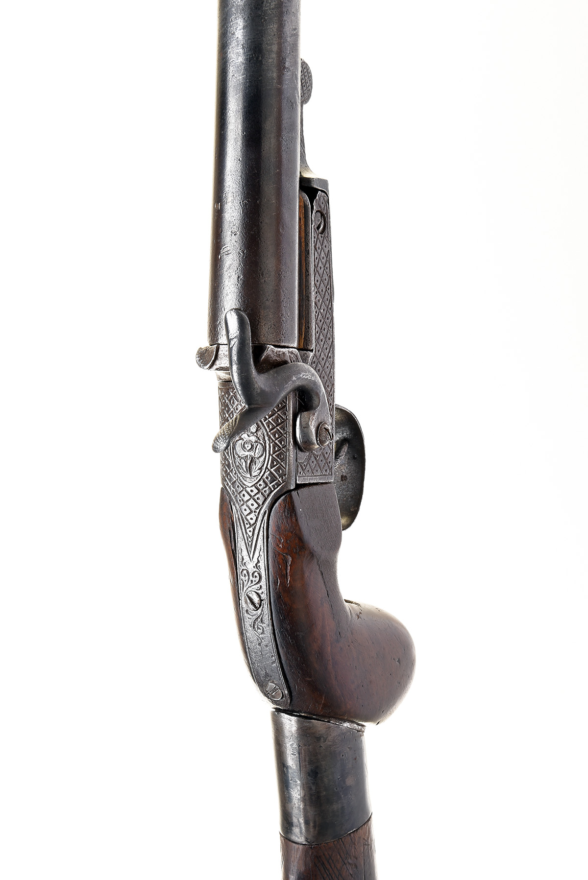 AN UNUSUAL 16-BORE PINFIRE SINGLE-BARRELLED TAKE-DOWN POACHER'S GUN SIGNED ST ETIENNE, no visible serial number, circa 1865, with turn-off 35 3/4in. plain barrel, the turn-off section allowing the remainder to be used as a pistol, machine engraved boxlock action with swing under-lever and side hammer, replacement bulbous wood grip with keyway in the back for a detachable butt-stock (included, no provision for fore-end