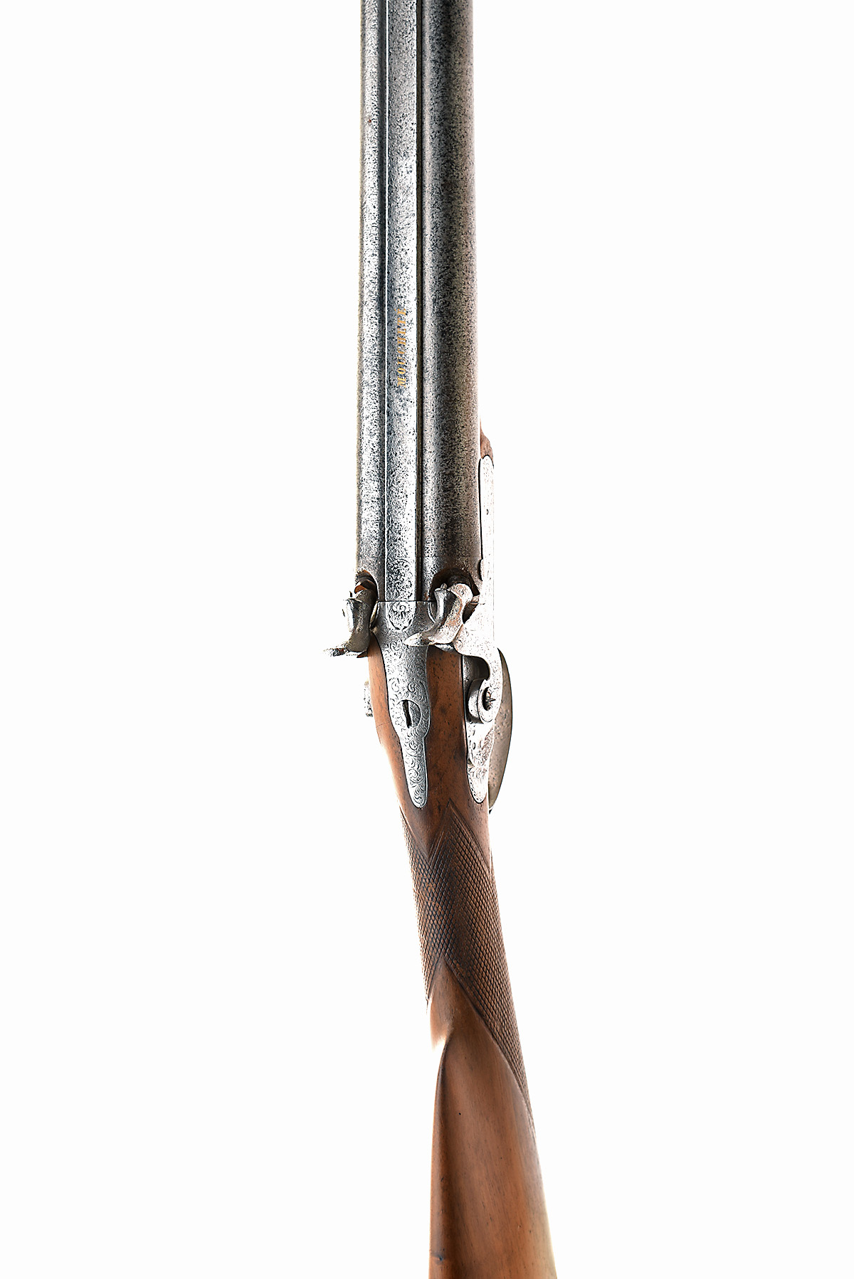 A 14-BORE PERCUSSION DOUBLE-BARRELLED SPORTING-GUN, signature obscured, no visible serial number,