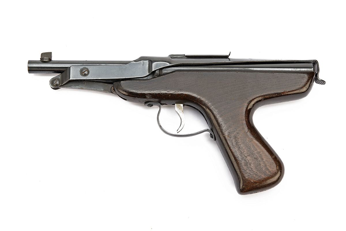 A .177 BRITISH DIANA MODEL IV LEVER-COCKING AIR-PISTOL, no visible serial number, date coded for October 1959, with blued 4 1/2in. barrel, blued receiver and cocking lever and beech one-piece receiver with integral smooth grip, generally collector's external condition