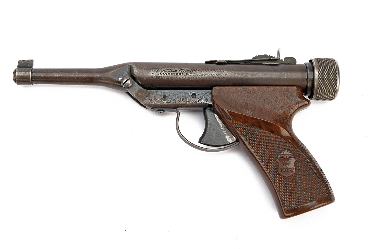 A .22 HY-SCORE CONCENTRIC-PISTON AIR-PISTOL, serial no. 889361, circa 1968, with internally mounted 10in. barrel, blade fore-sight and buckhorn rear-sight, iris aperture for loading at rear, partially scroll engraved frame and chequered red-brown mottled hard plastic grip, finish faded