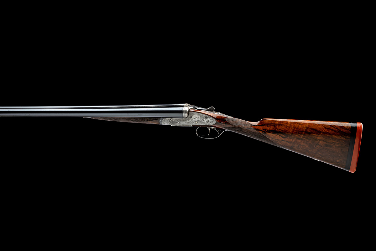 for 1921, 27in. replacement Greener trademark steel nitro reproved barrels (in 2025), the rib engraved 'W.W. GREENER. MAKER. 40. PALL MALL. LONDON. WORKS. BIRMINGHAM.', 2 3/4in. chambers, bored approx. 1/4 choke in both, treble-grip action with hidden third bite, automatic safety with gold-inlaid 'SAFE' detail, gold-inlaid cocking-indicators, fine acanthus scroll engraving surrounding game scene vignettes of hound and fowl, 15in. well-figured stock including 1in. recoil pad, fore-end with Deeley & Edge patent release and horn finial, weight 6lb. 12oz., in its brass-cornered oak and leather case