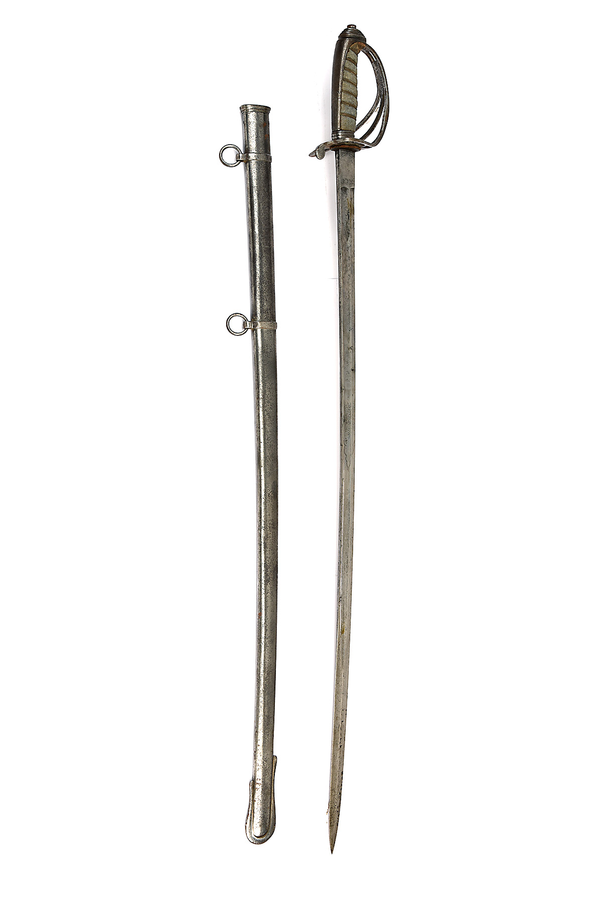 A PATTERN 1821 VICTORIAN LIGHT CAVALRY OFFICER'S SWORD, mid-19th Century, with 35 1/4 in. slightly curved steel blade fullered on each side, engraved both sides with scroll-work and queen's crown above royal cypher, ricasso with proved plug, 3-barred guard, wire-bound fish-skin grip, together with its steel scabbard, worn, blade rubbed, maker's details rubbed out, all exposed metalwork with significant blinded pitting, grip with losses at the pommel, scabbard throat screws absent